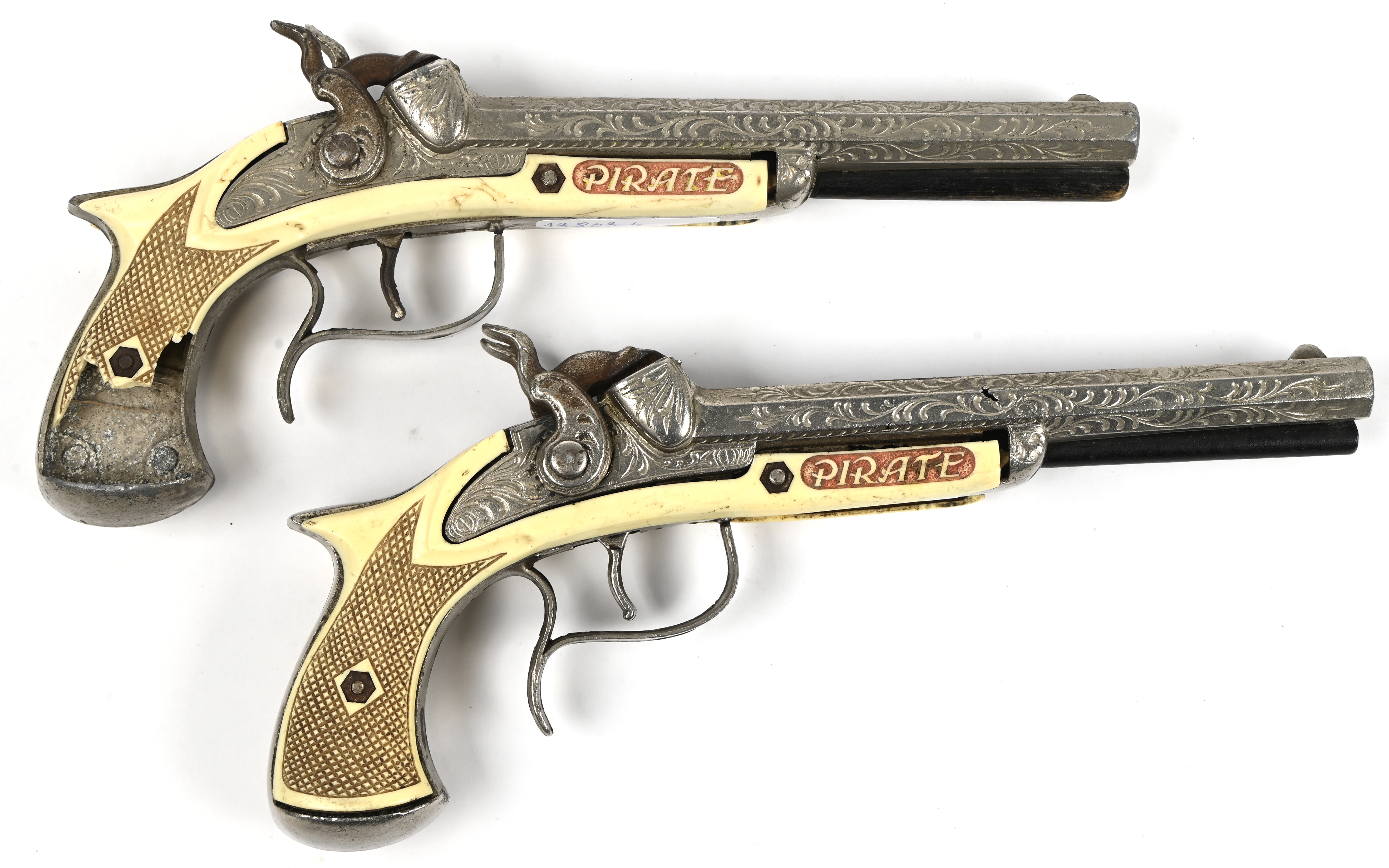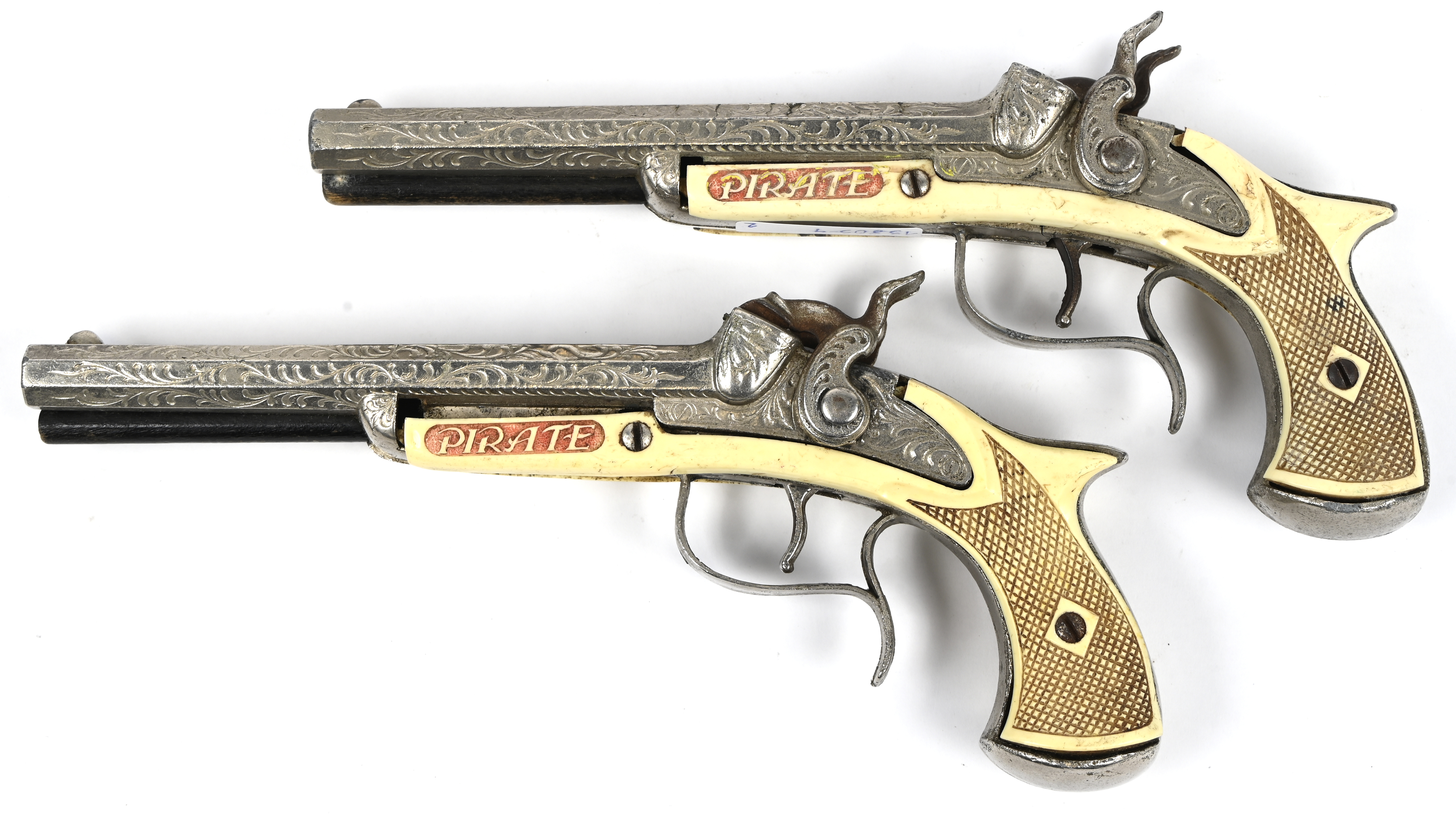 ‘Pirate’. Set van 2 vintage speelgoedpistolen. Jaren 60. 1 heeft ruime schade, het ander pistool is in goede staat.