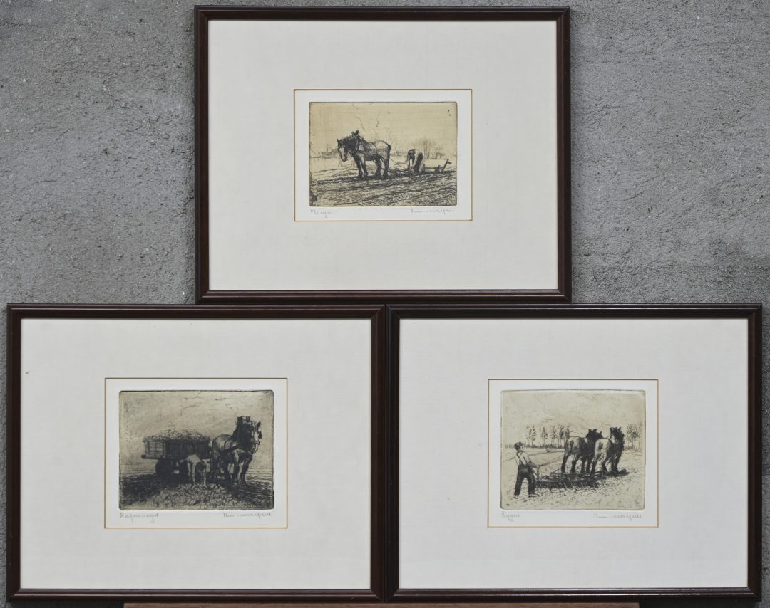 ‘Ploegen’, ‘Eggen’ en ‘Rapenoogst’. Drie monochrome etsen, getekend Rom. Malfliet.