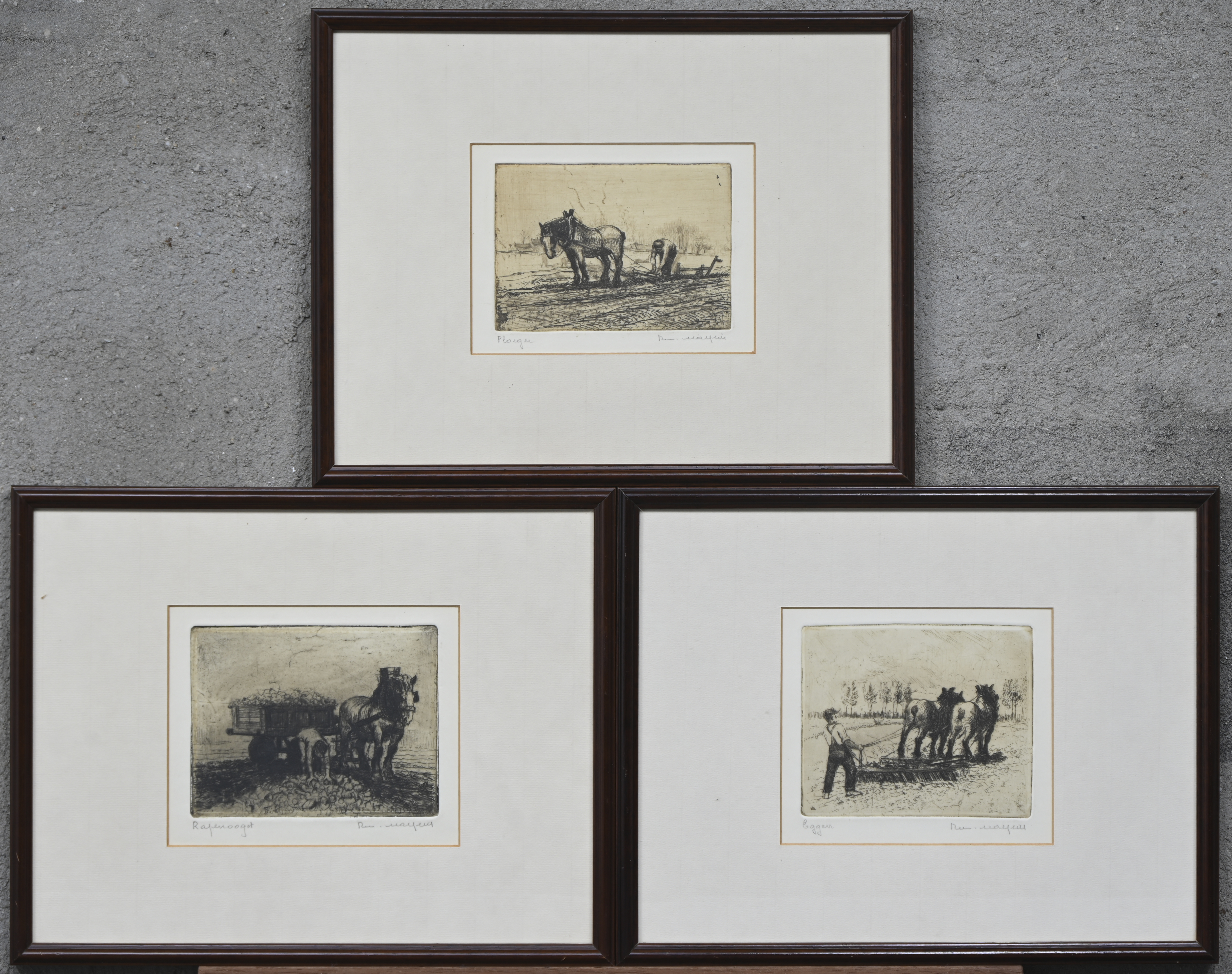 ‘Ploughing’, ‘Harrowing’ and ‘Turnip Harvest’. Three monochrome etchings, signed Rom. Malfliet.