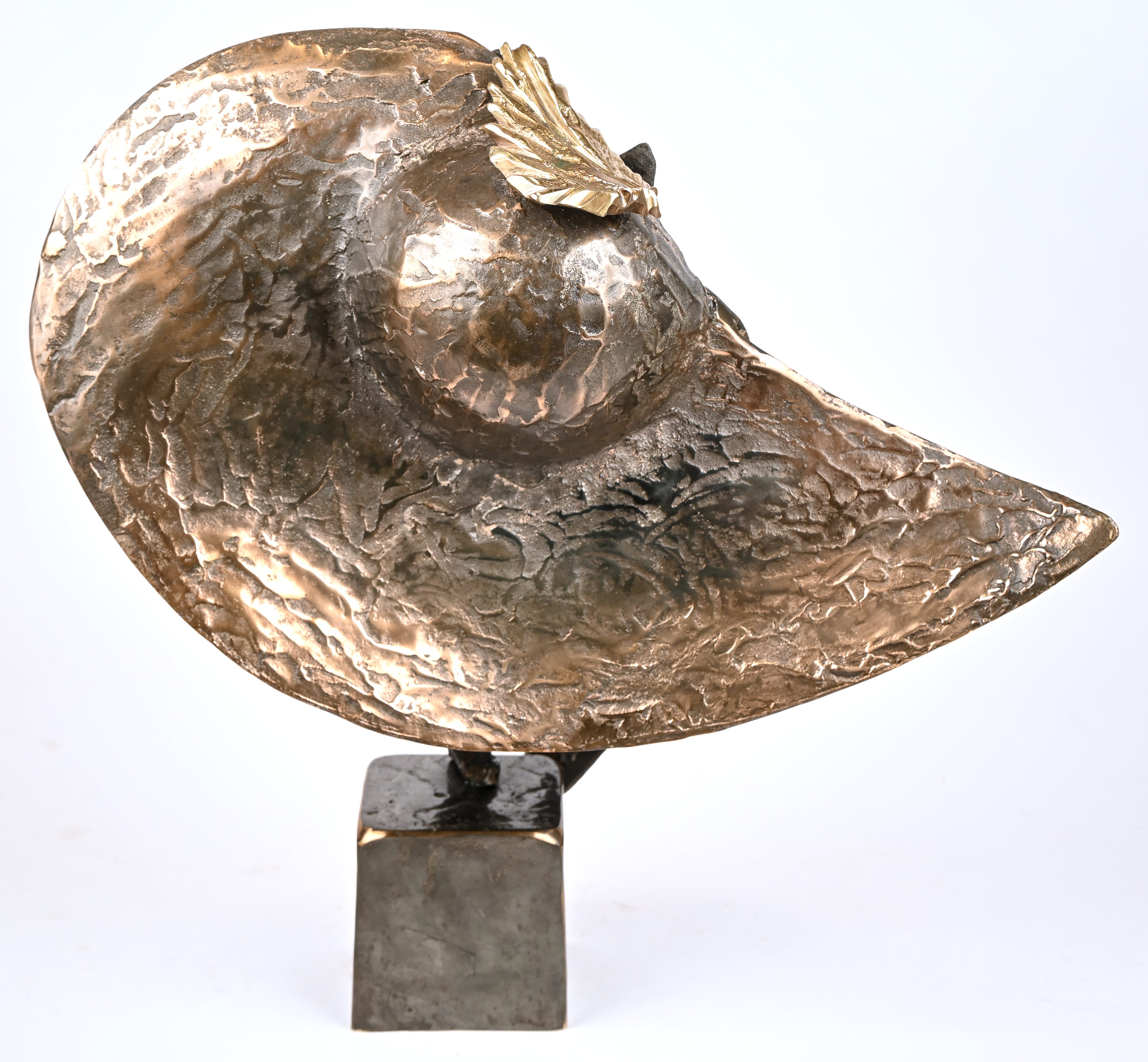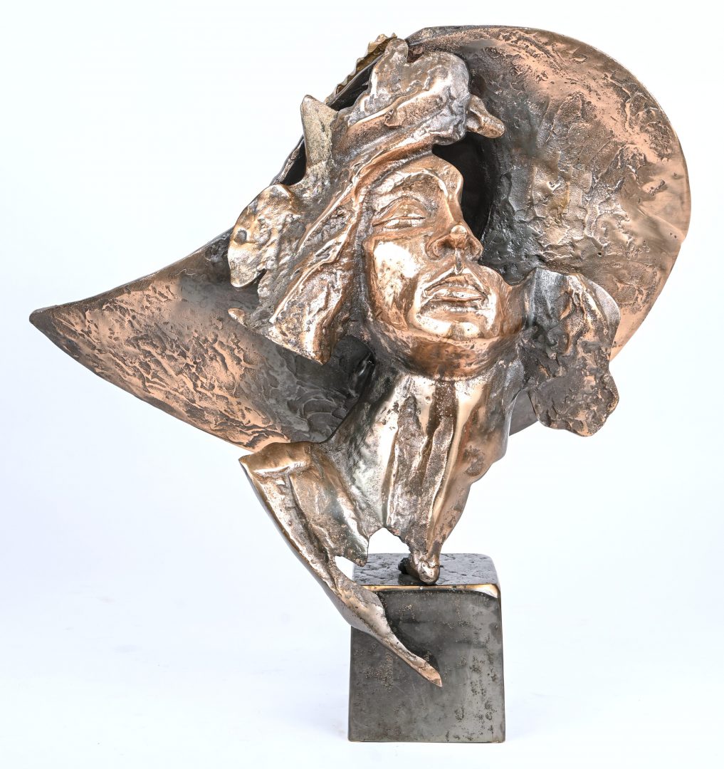 'Portrait of a Woman with Summer Hat'. A bronze sculpture on pedestal, presumably by Yves Lohe.