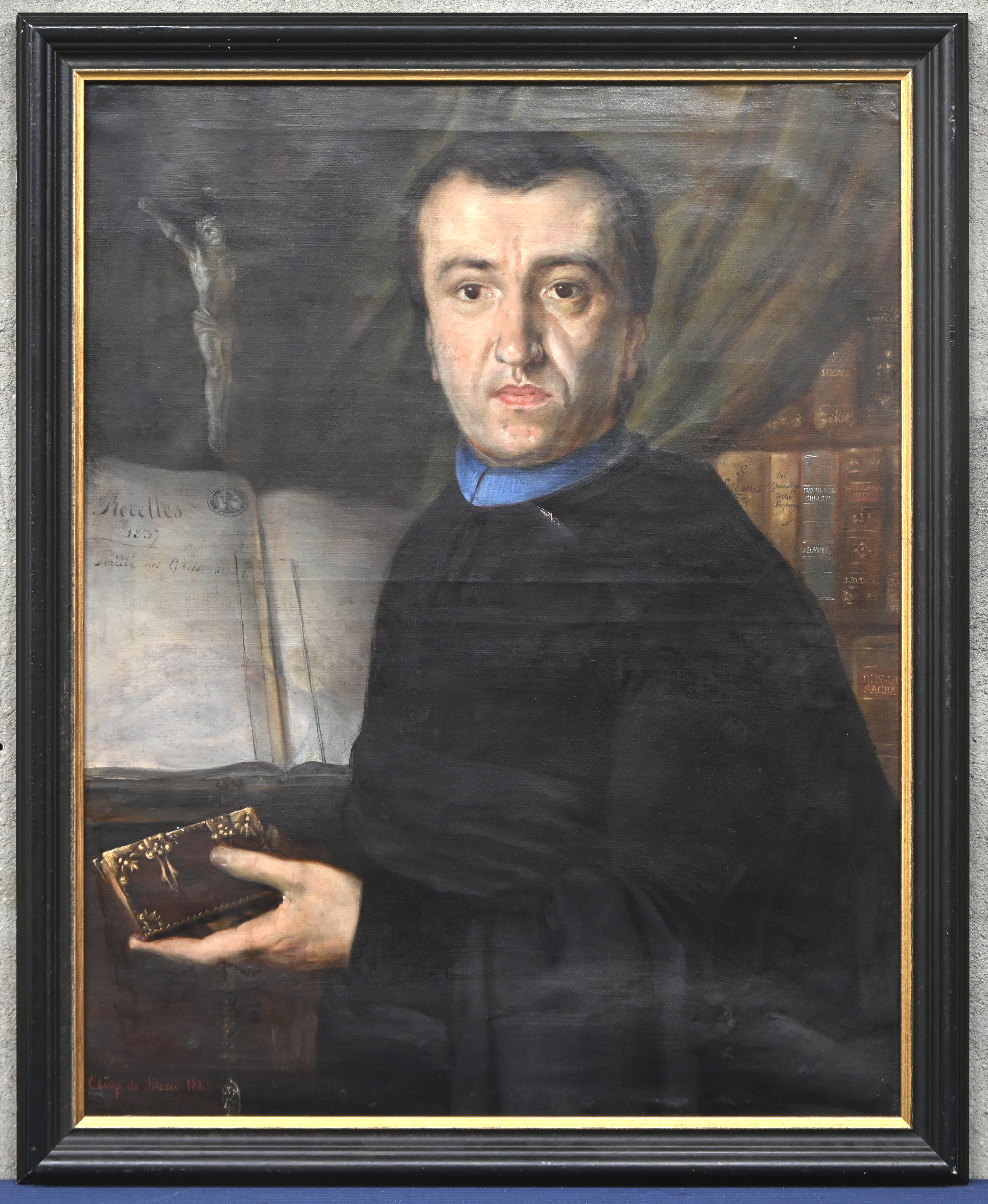 “Half-length portrait of a man with a Bible,” an oil painting on canvas. Signed Aug. De Succa, 1845. With slight damage to the paint layer.