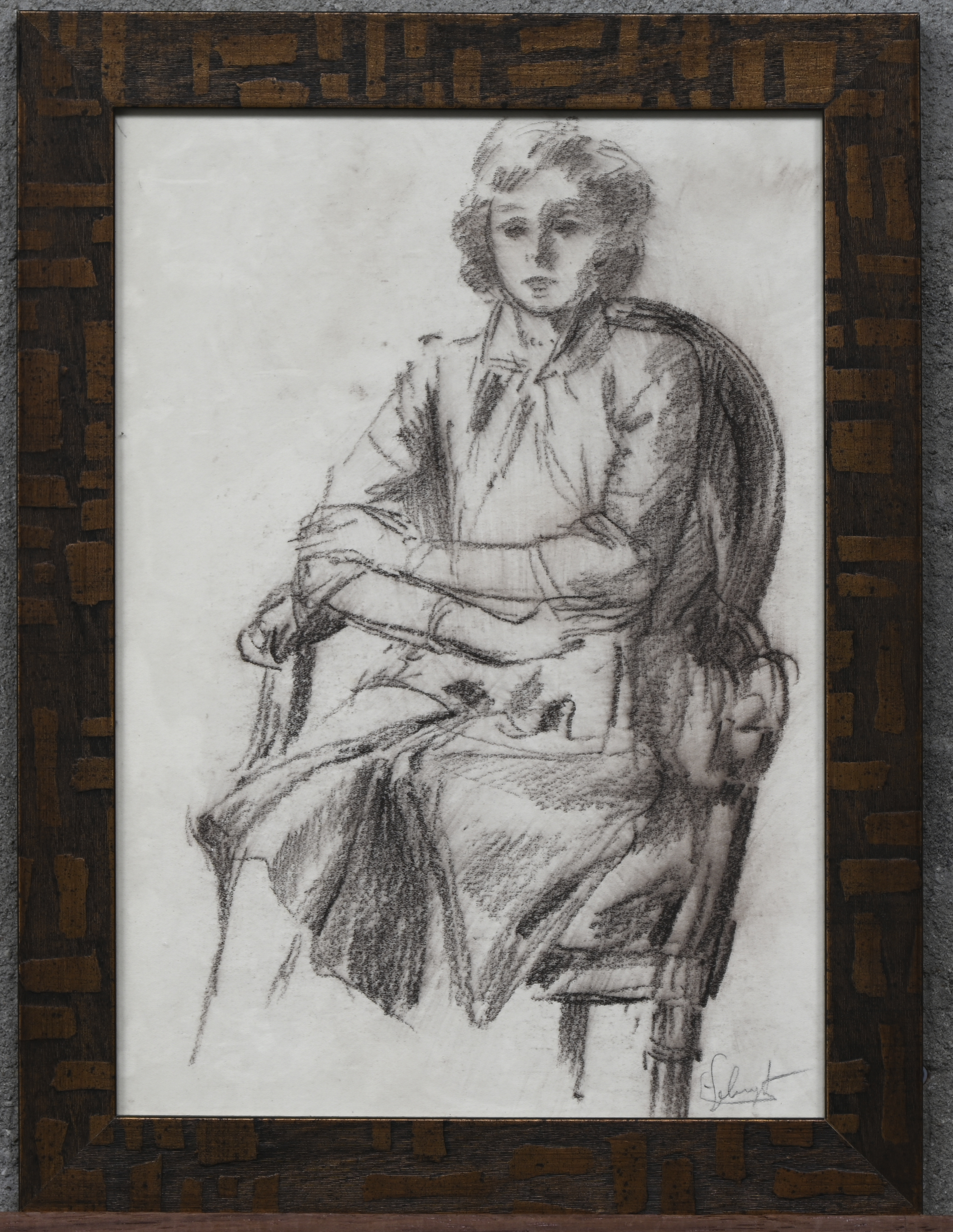 'Sitting Man', drawing in sepia. Indecipherable signature. -