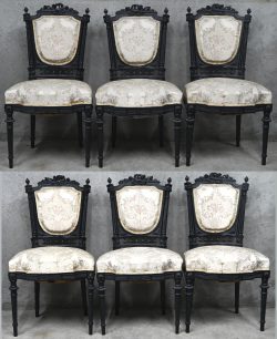A set of 6 antique Napoleon III style chairs, black painted wood with upholstery in fabric featuring floral decor. -