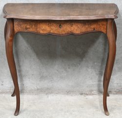 #576Een antieke Franse console met één lade in Louis XV-stijl, hout met wortelnotenfineer.