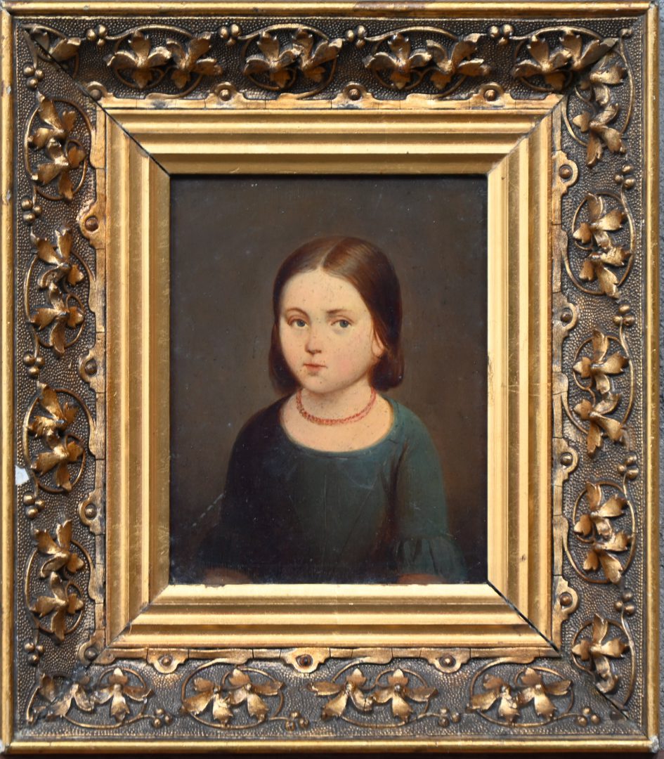 ‘Portret van een jong meisje’, een 19e eeuw olieverfschilderij op paneel. Op de rug getekend.