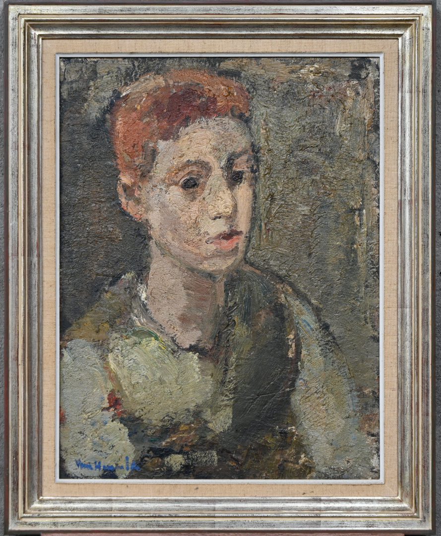 ‘Portret van een jonge man’, een impasto olieverfschilderij op paneel. Getekend Van Heesvelde, op de rug getekend en gedateerd.