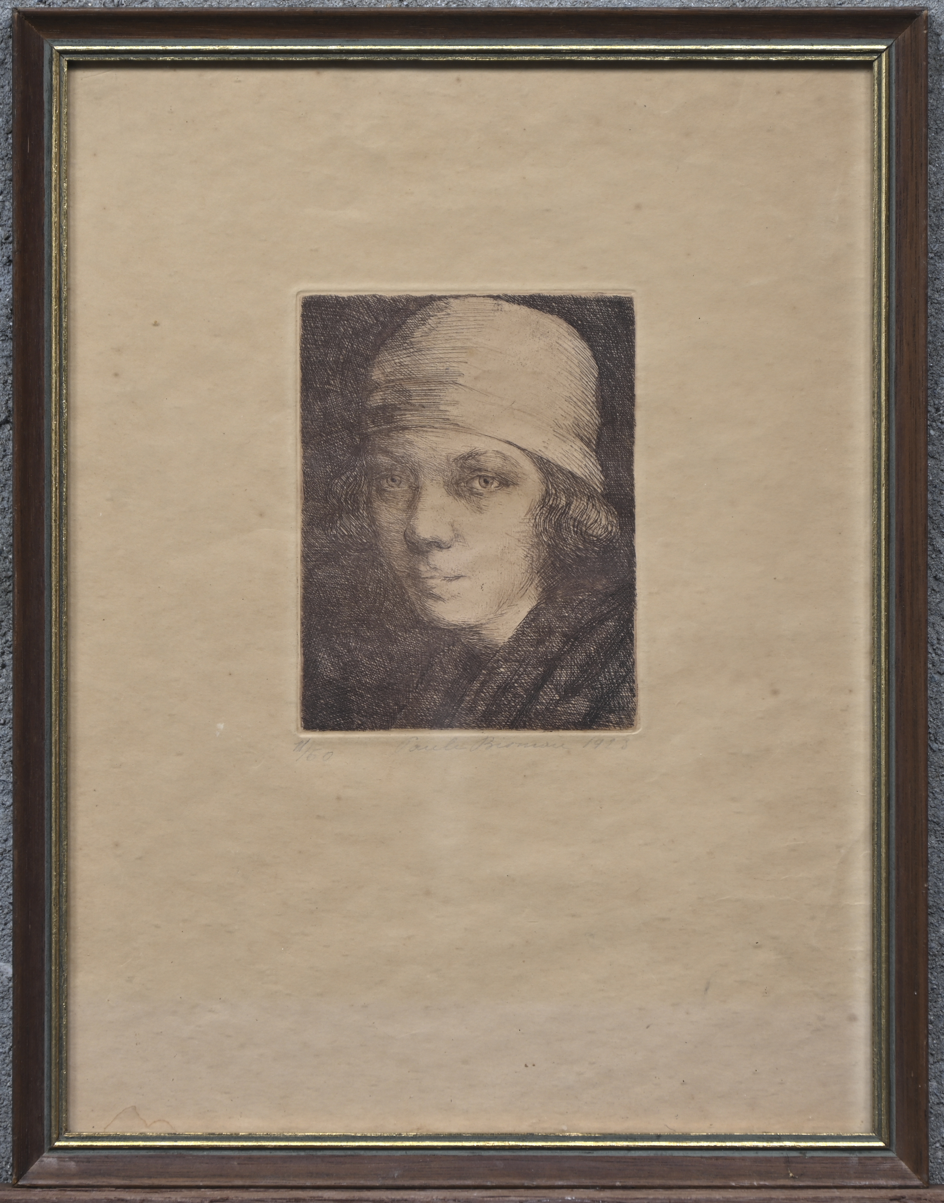 “Portrait of a Young Woman,” a monochrome etching. Signed Paule Bisman.