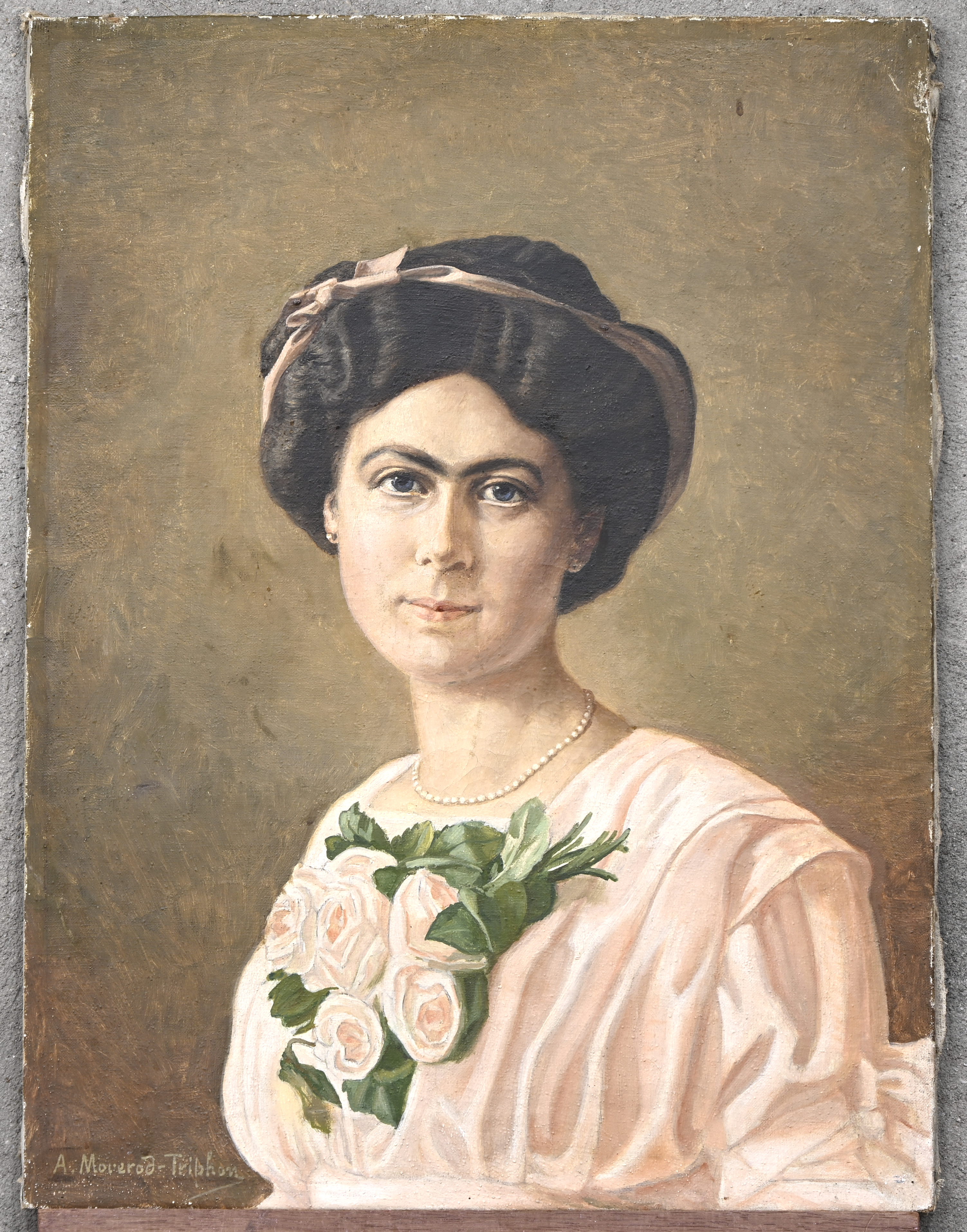 Portrait of a young woman in a pink dress, oil on canvas. Signed A. Morerod-Triphon.