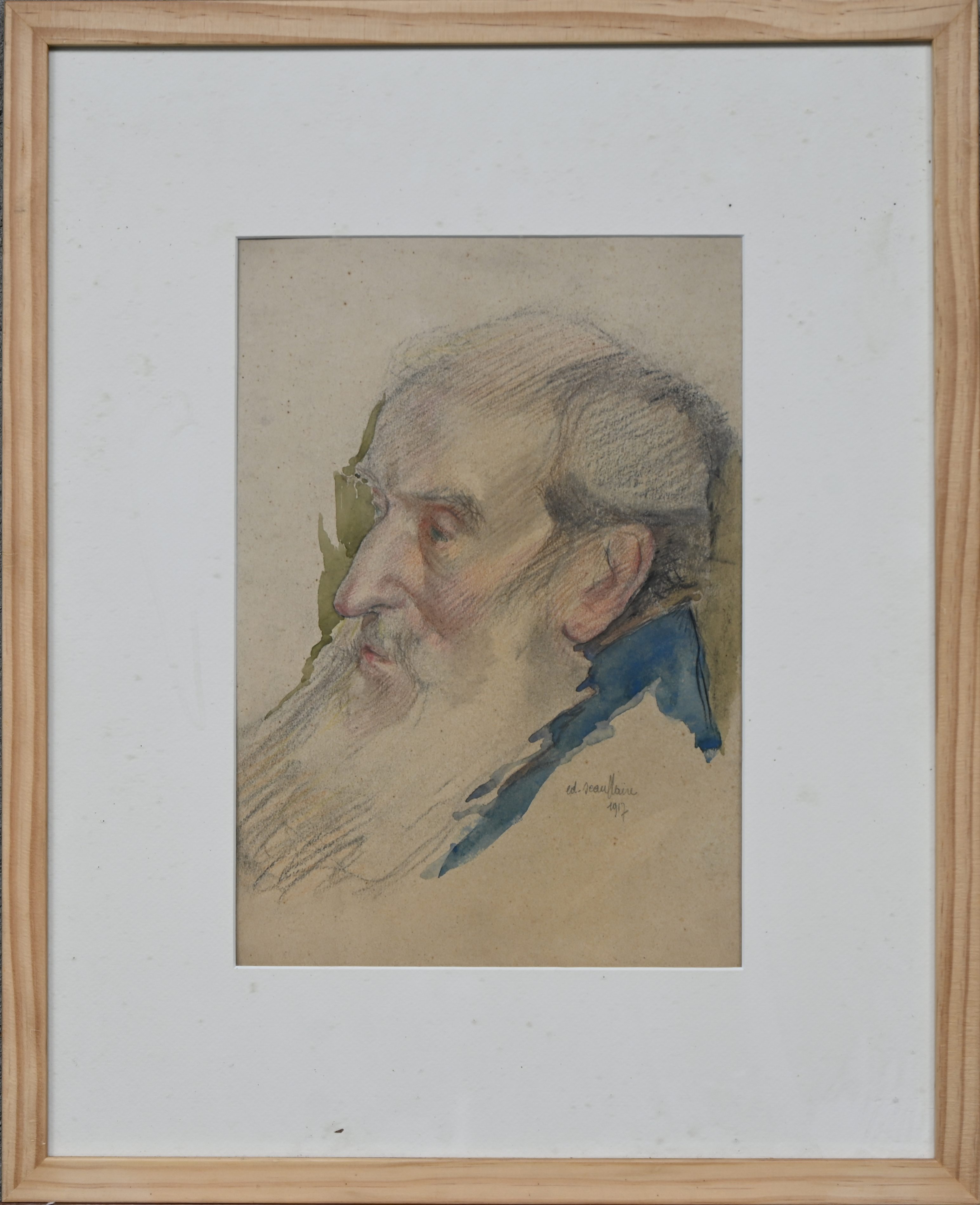 ‘Portrait of a man with a beard’, pencil and watercolor on paper. Signed Ed. Scauflaire, 1917.