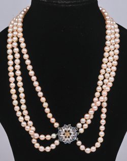 #300Een drie rijen parelhalssnoer met 18 witgouden slot bezet met saffier. (twee steentjes ontbreken).