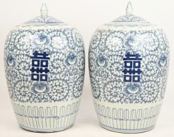 #381Een paar gemberpotten van blauw en wit porselein, met lang levensymbolen. Met porseleinen deksels.
