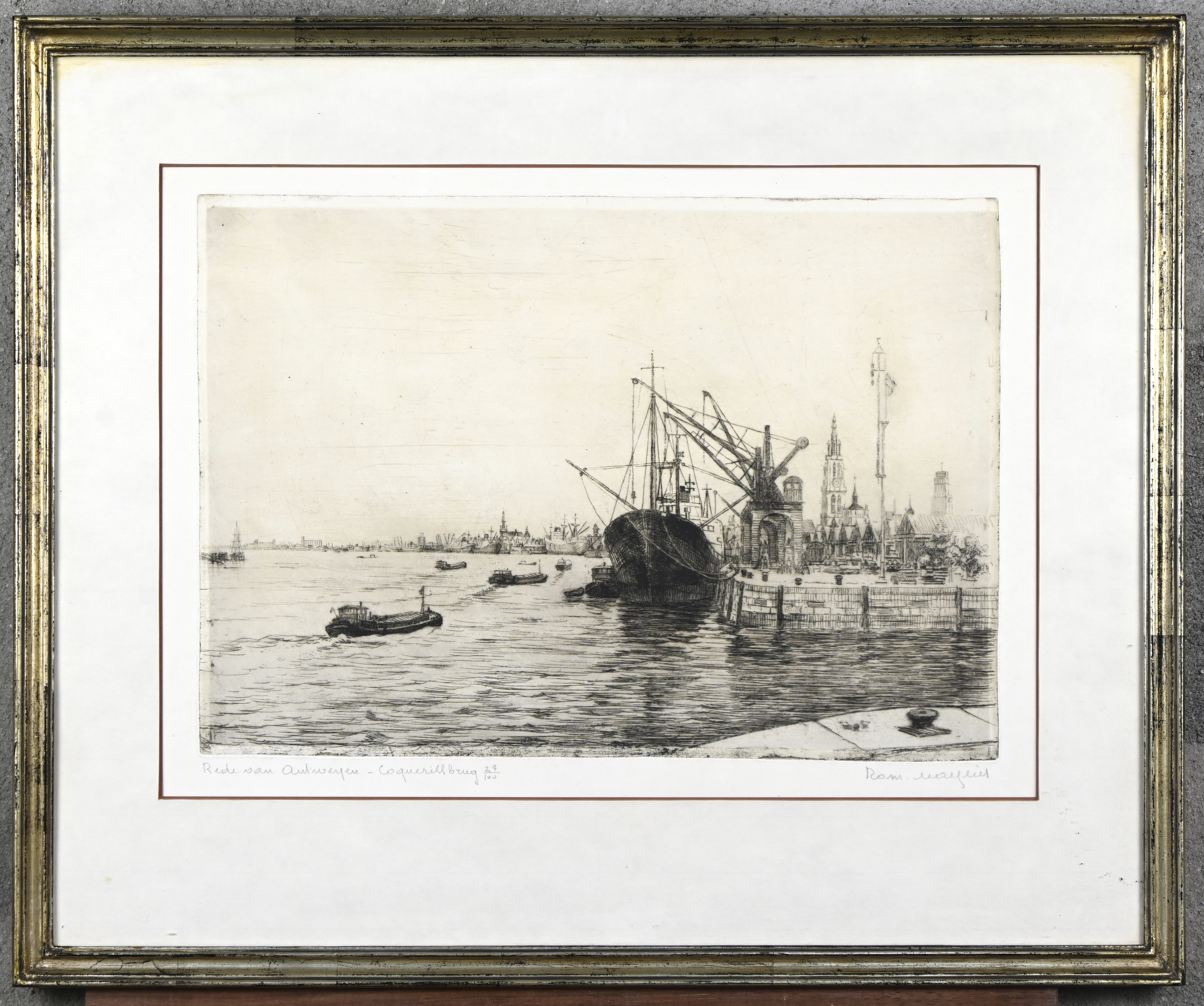 ‘Antwerpen’ en ‘Vlissingen’, een lot van twee antieke ingekleurde etsen.