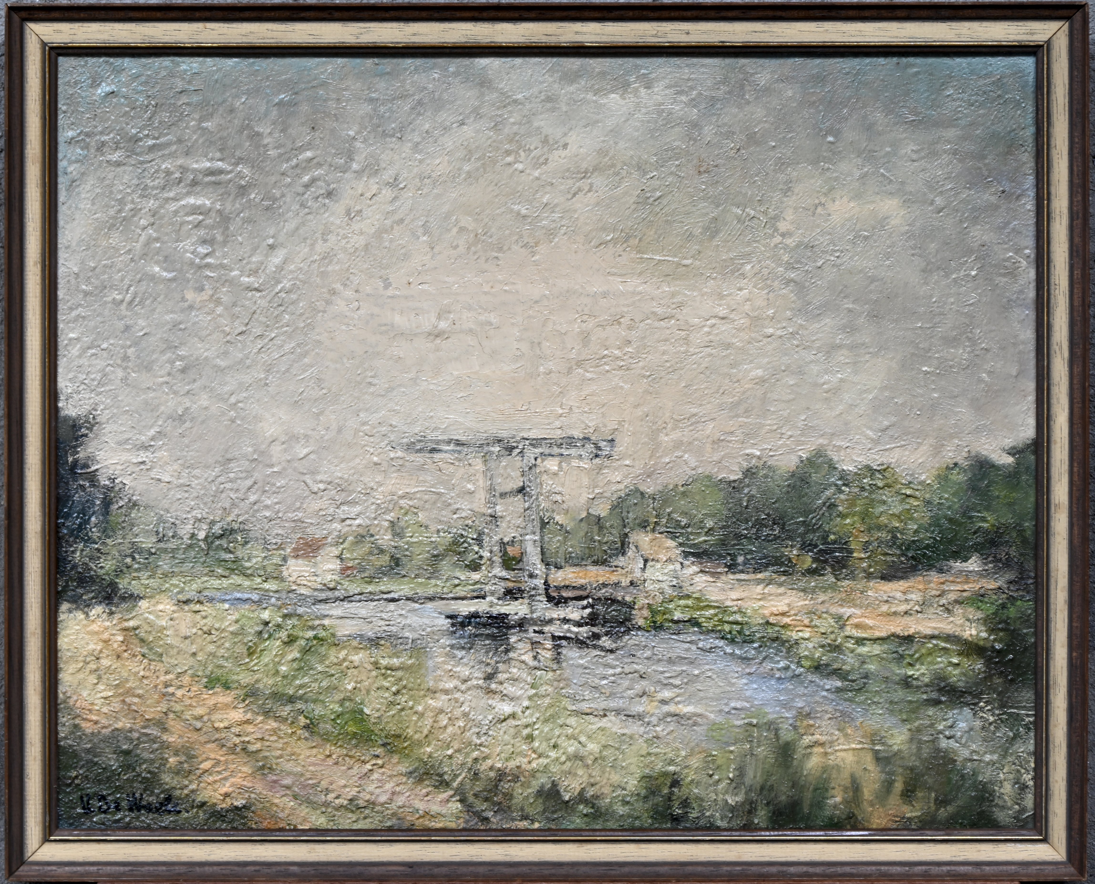 ‘Rivierzicht met brug’, olieverf op doek. Getekend V. De Waele.