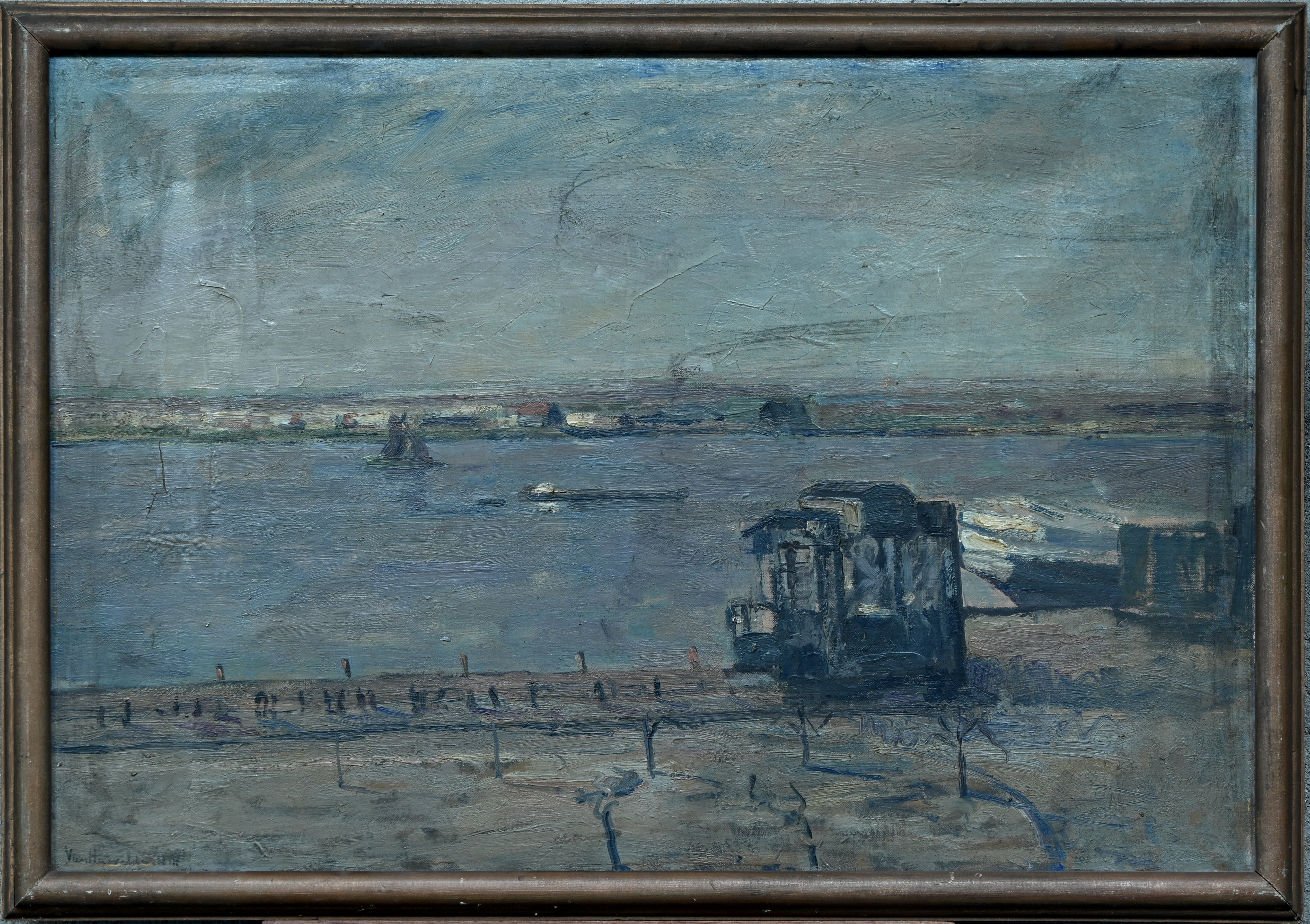 ‘Rivierzicht met vrachtschepen’, olieverf op doek. Getekend Van Heesvelde Hipp., op de rug getekend en gedateerd 1928. Met een herstelling aan het doek.