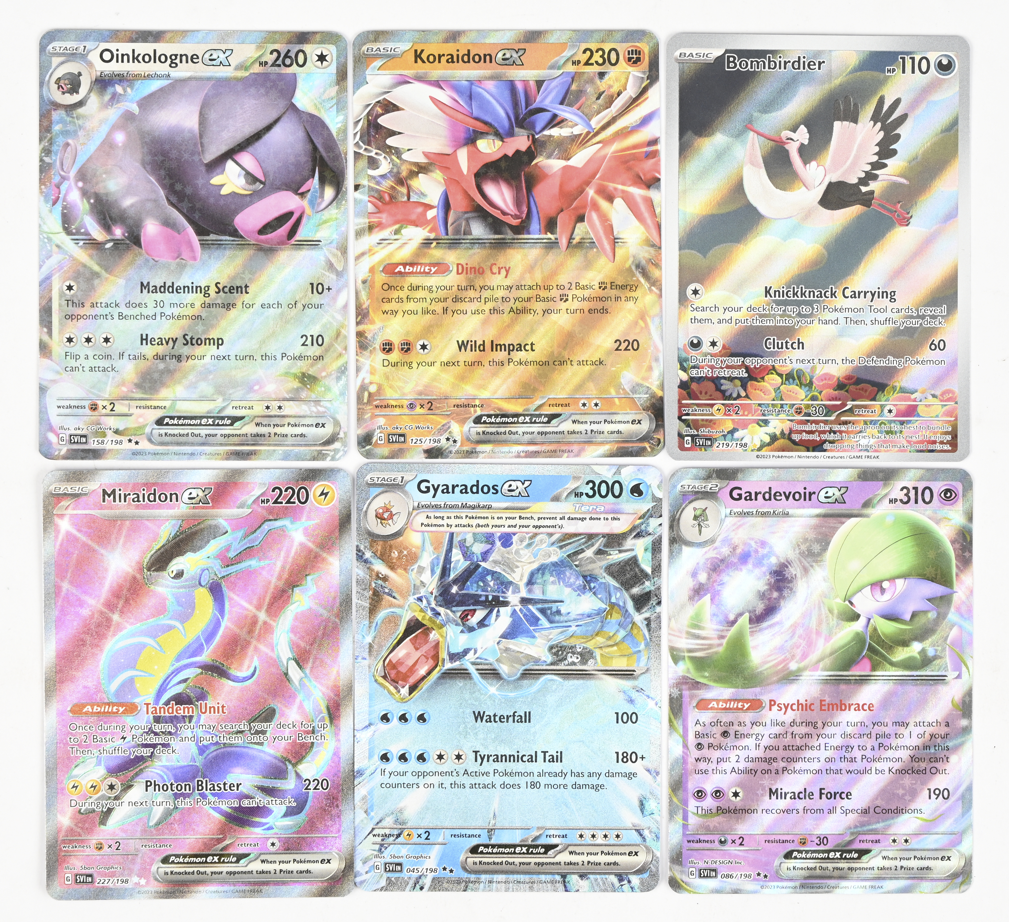 Scarlet & Violet Base Set Miraidon ex 227/198 Ultra Rare Holofoil 2.52Scarlet & Violet Base Set Gyarados ex 045/198 Double Rare Holofoil 0.94Paldean Fates Gardevoir ex 029/091 Double Rare Holofoil 0.5Scarlet & Violet Base Set Bombirdier 219/198 Illustration Rare Holofoil 3.29Scarlet & Violet Base Set Koraidon ex 125/198 Double Rare Holofoil 0.42Scarlet & Violet Base Set Oinkologne ex 158/198 Double Rare Holofoil 0.49