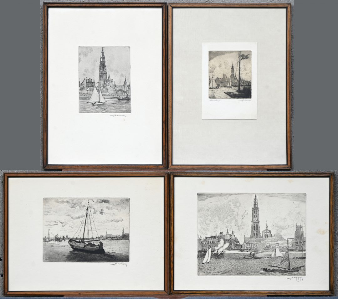 ‘Schepen op de Schelde’, vier monochrome etsen. Getekend buiten de plaat ‘J. Severin’.