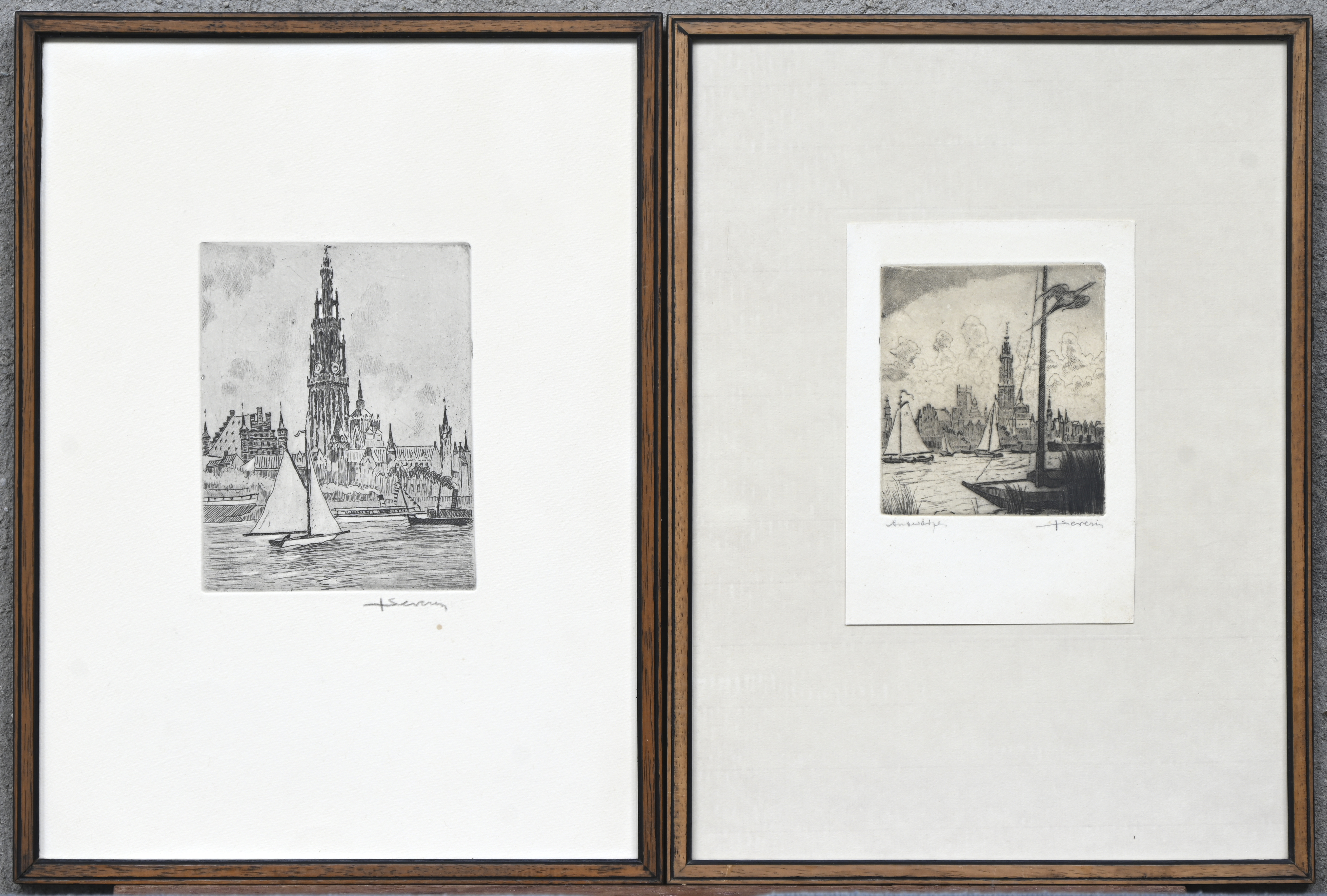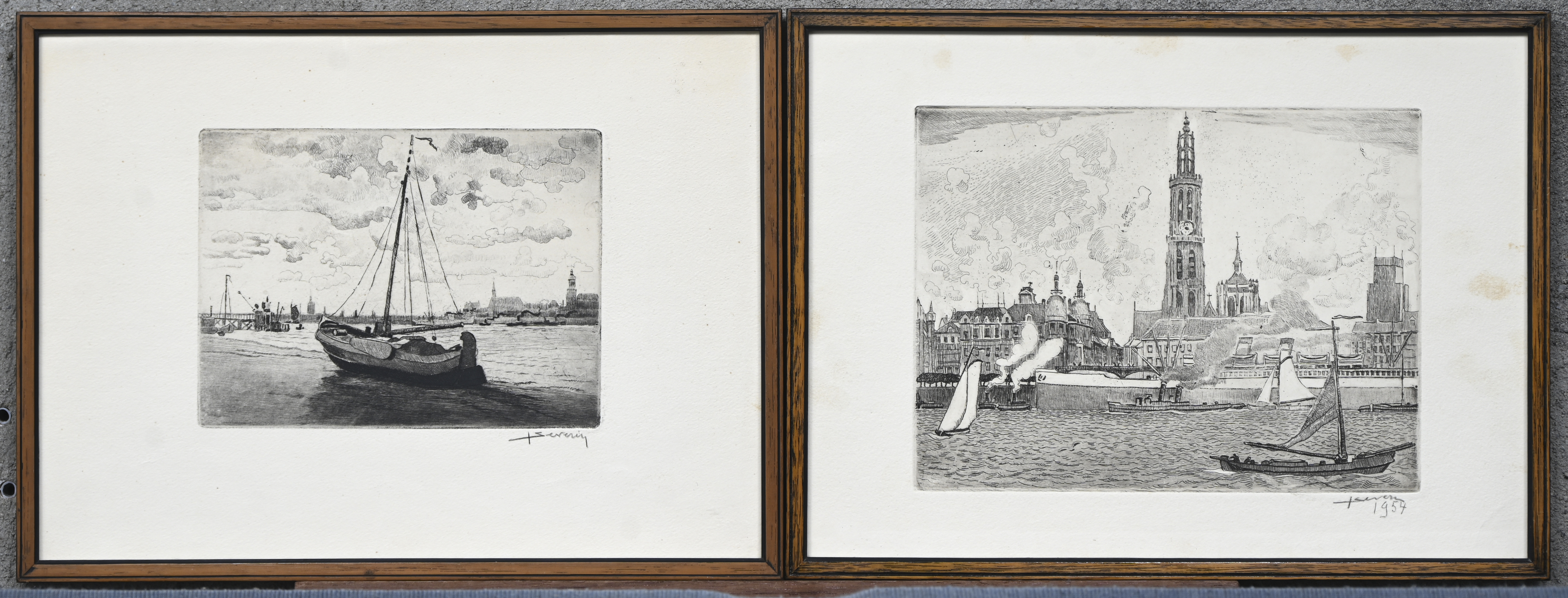 “Ships on the Scheldt,” four monochrome etchings. Signed outside the plate “J. Severin”.