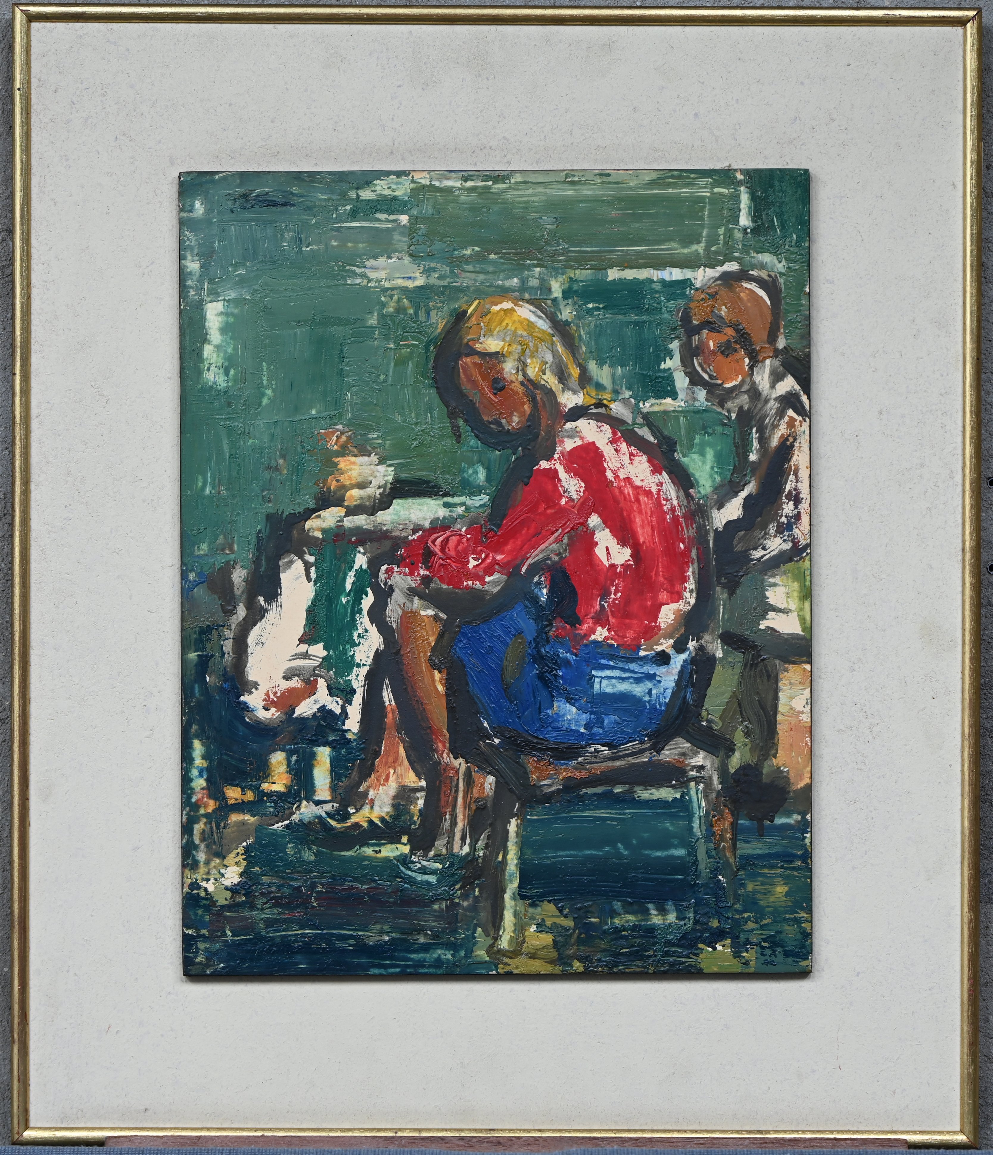 “Schoolmeisjes”. Olieverf op paneel. Onleesbaar gesigneerd/