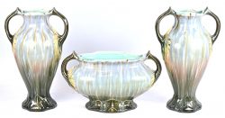 A glazed Flemish earthenware garniture consisting of a cache-pot and 2 vases. -