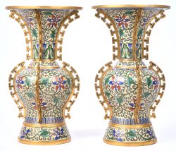 Three cloisonné vases. One black vase with a design of blossom branches and cranes, and a set of two with finches on a background of flowers. -