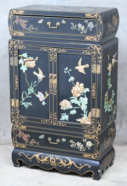 #356Een Chinees kastje van zwart gelakt hout met twee deuren en twee laden. Versierd met pietra dura en een handgeschilderd decor van bloemen en vogels.
