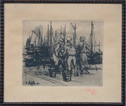 'Fishermen, a monochrome etching. Signed A. Oleffe.' -