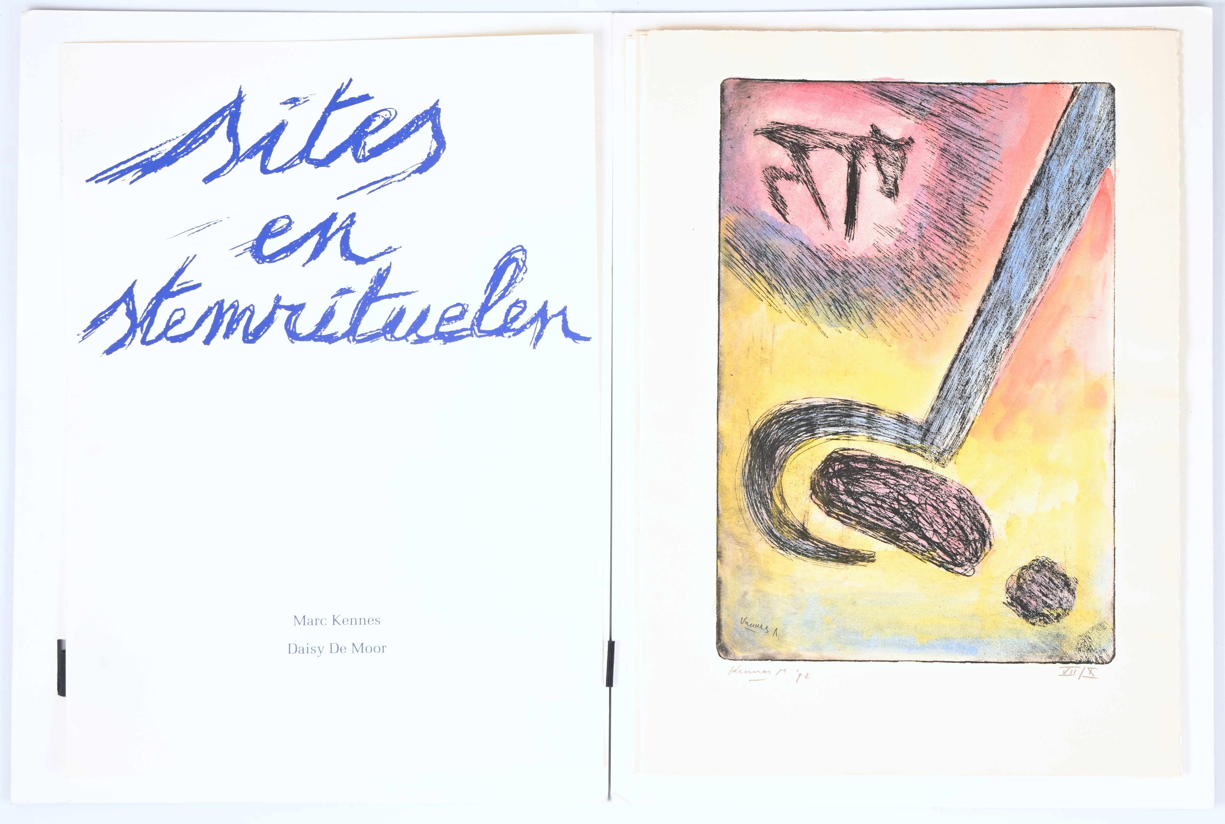 ‘Sites en stemrituelen’, een map met 4 etsen door Marc Kennes en 4 gedichten door Daisy de Moor. Nr. 7 uit een oplage van 10 exemplaren.