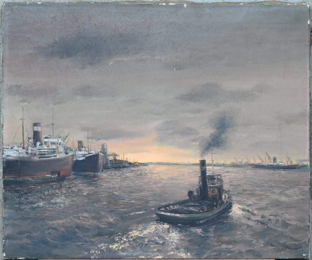 ‘Sleepboot in de haven’, een postimpresionistisch olieverfschilderij op doek. Niet getekend, zonder kader.