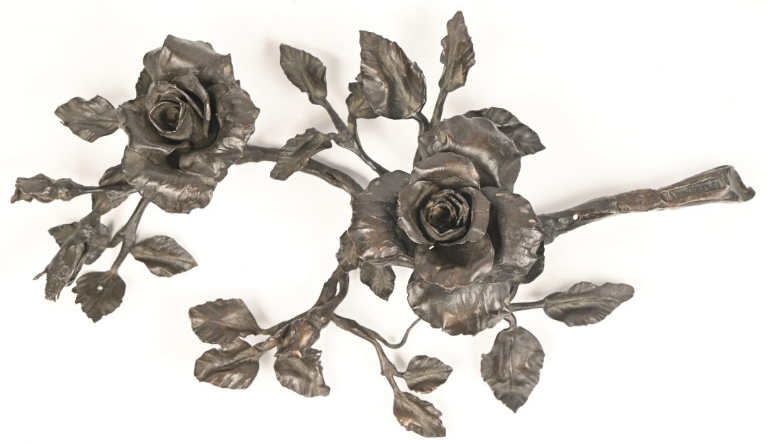 Een bronzen leeuwenkop met een dubbele sleutel in de bek. Mogelijk als meubelversiering. Omstreeks 1900.
