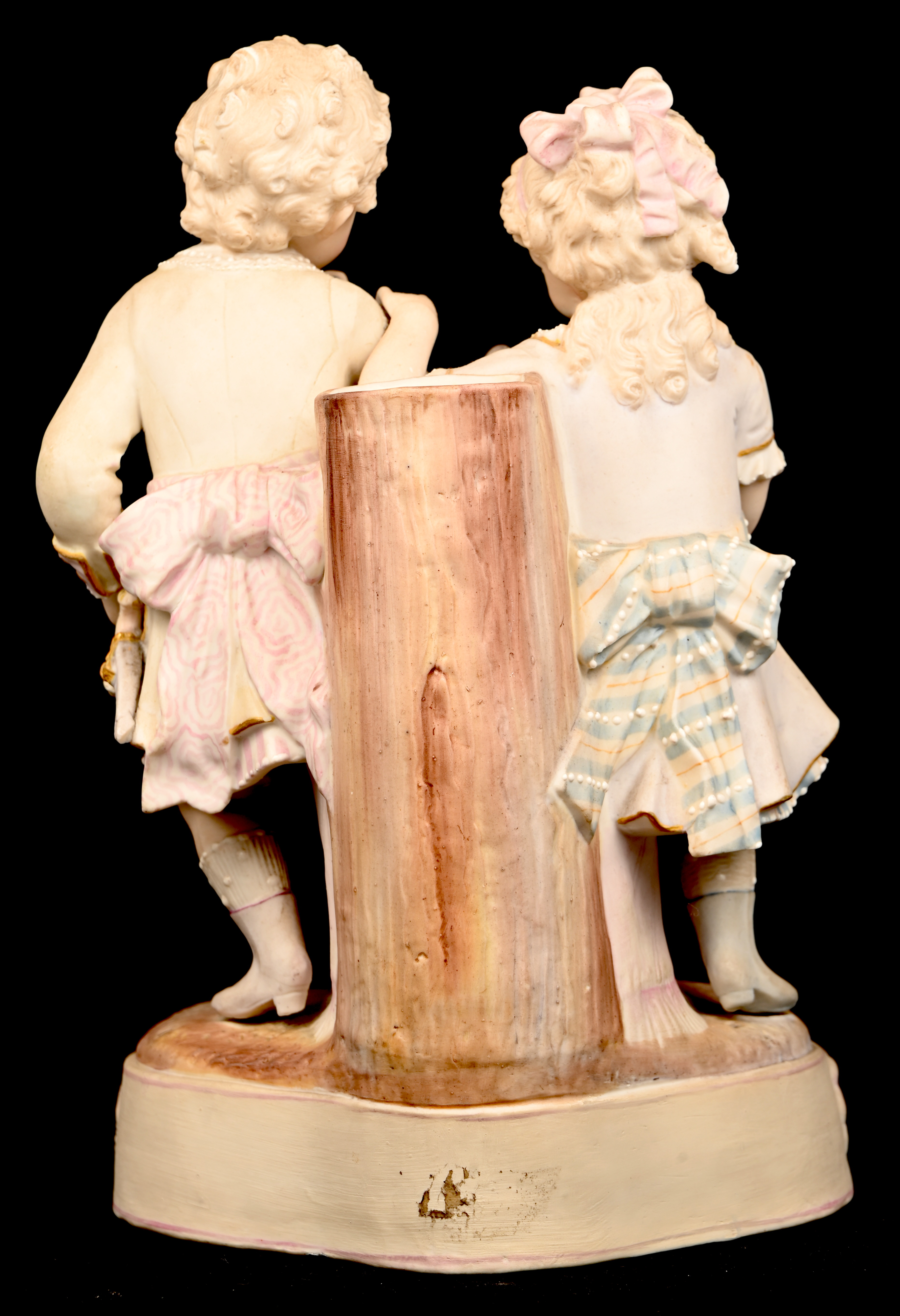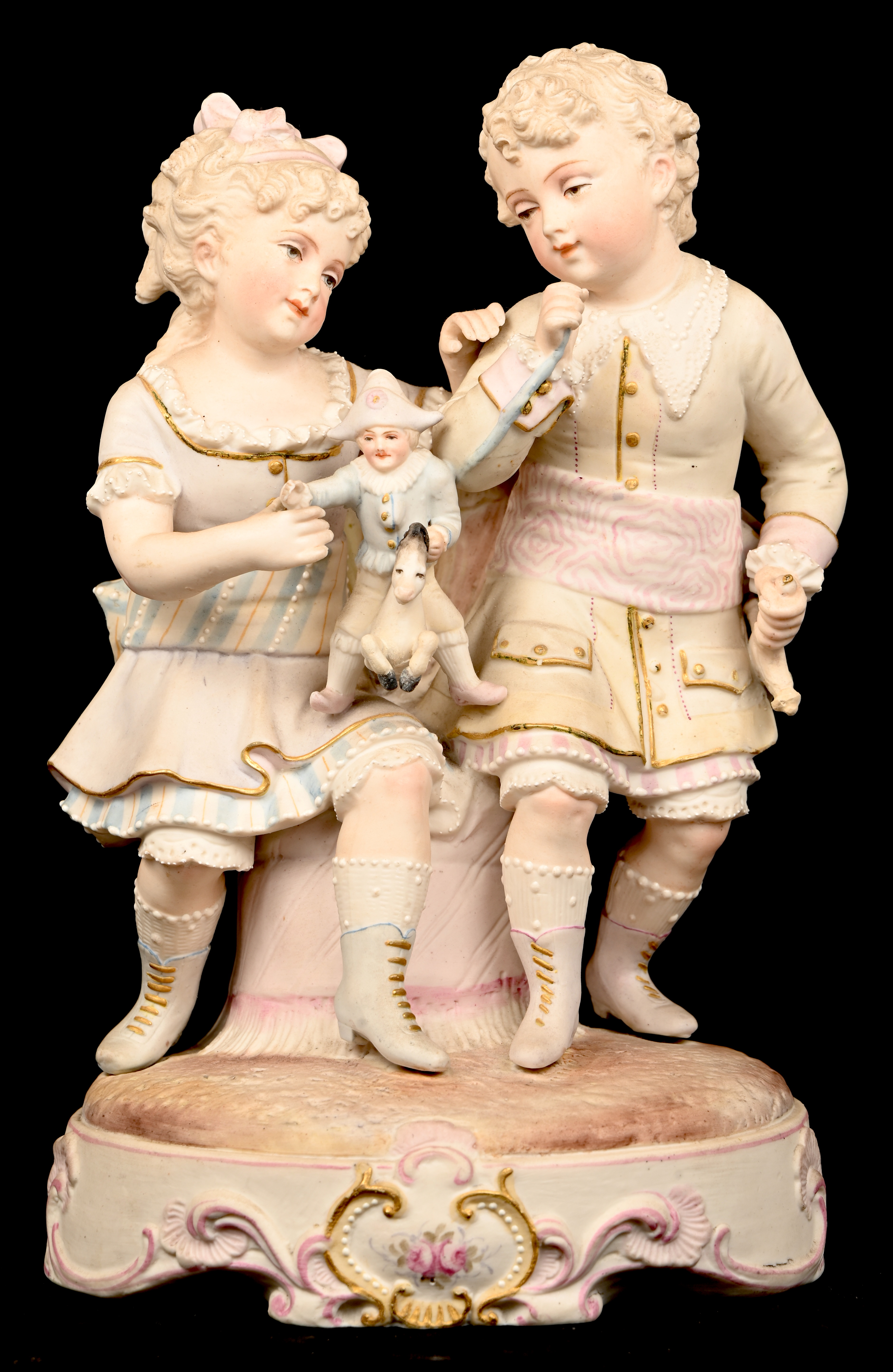 #190Een tète à tète in deels geglazuurd biscuit, gemonogrammeerd PK.