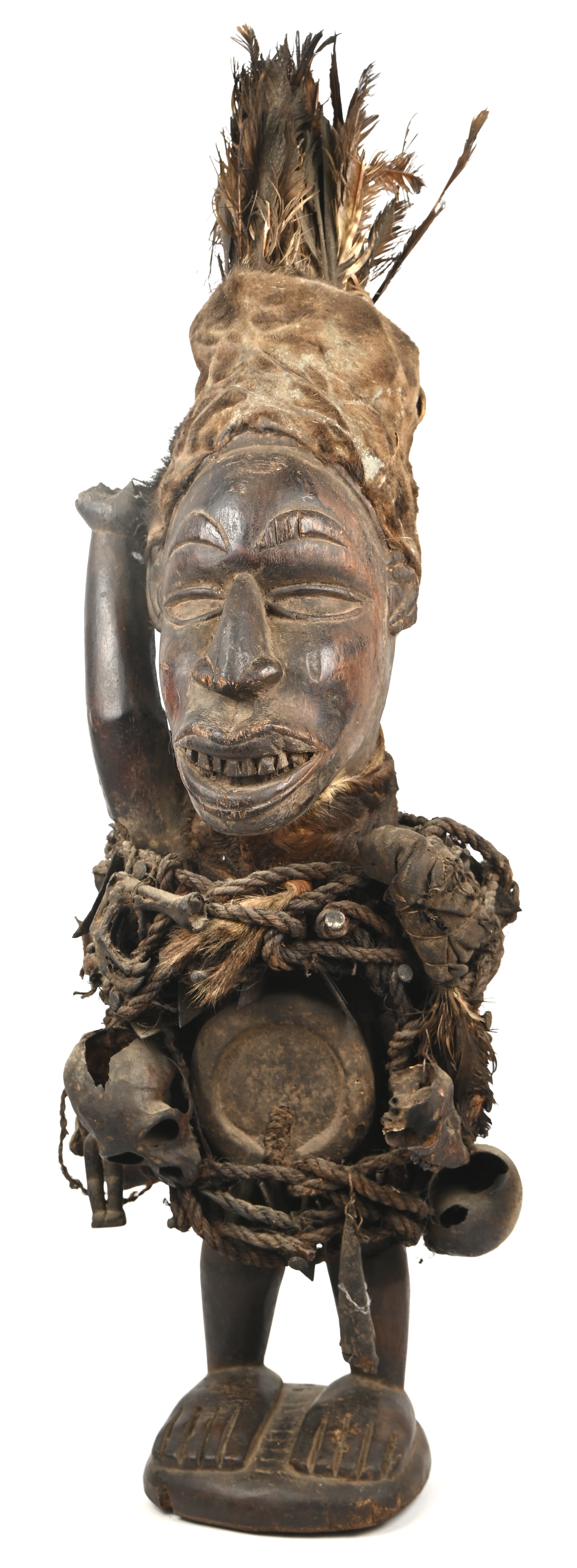 “Spijkerfetisj”. Houten beeld met talrijke verschilldene attributen en apenschedeltjes. Met vedertooi. Nkisi Nkonde. Loango, beneden Congo.