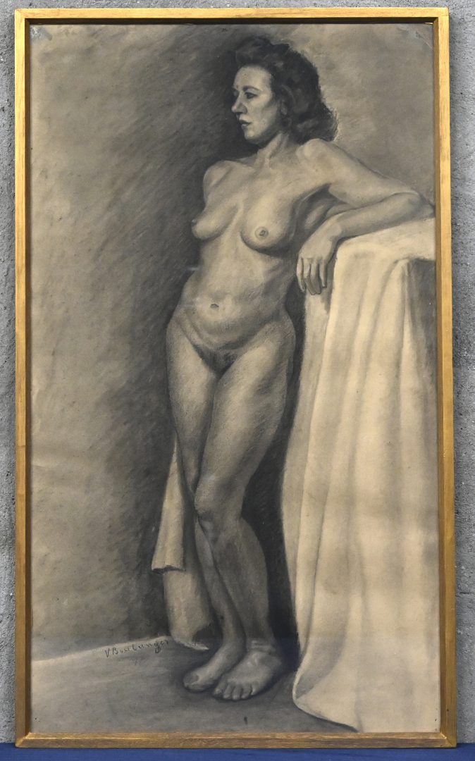 "Standing nude," a drawing, graphite on paper, signed V. Boulanger and dated 1947.
