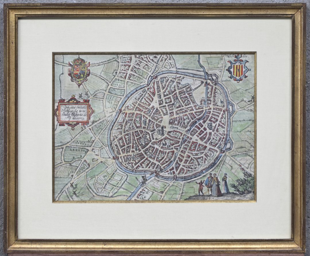 “City plan of Mechelen,” a colored antique engraving. With central fold, 17th century.