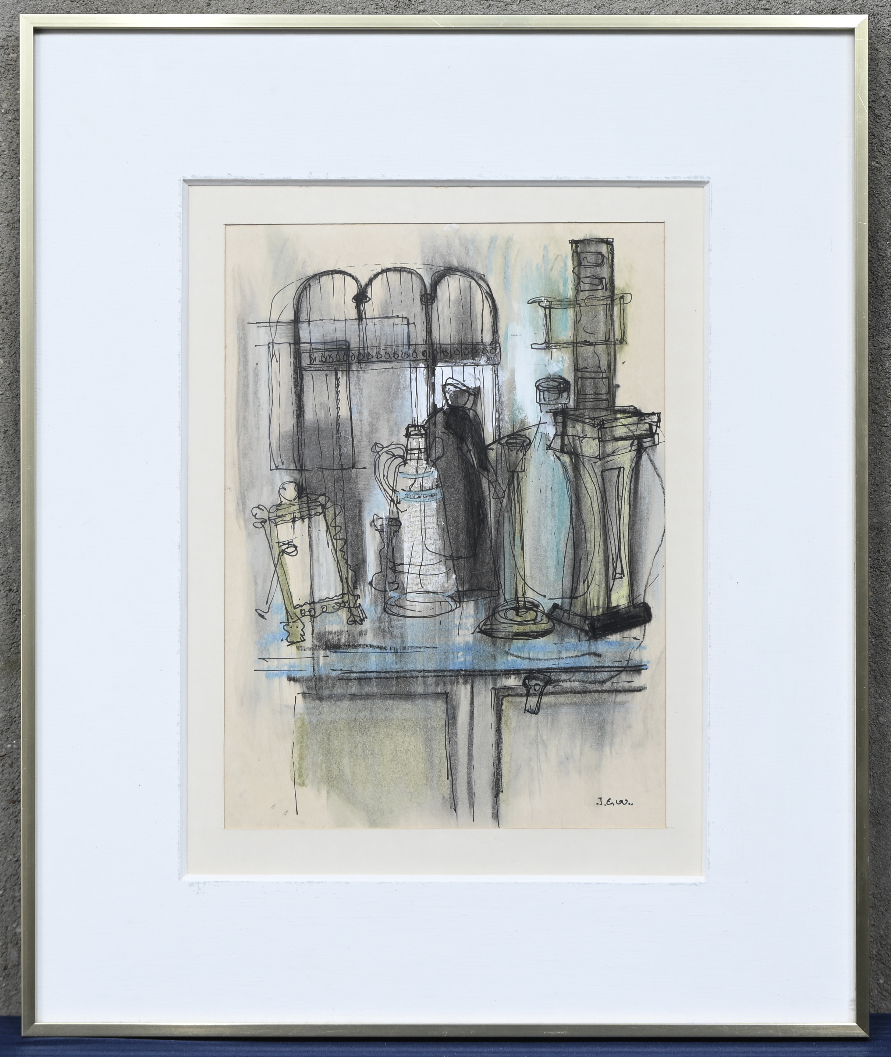 “Stilleven”, een werk op papier, gemengde techniek, gemonogrammeerd J.E.V.V.