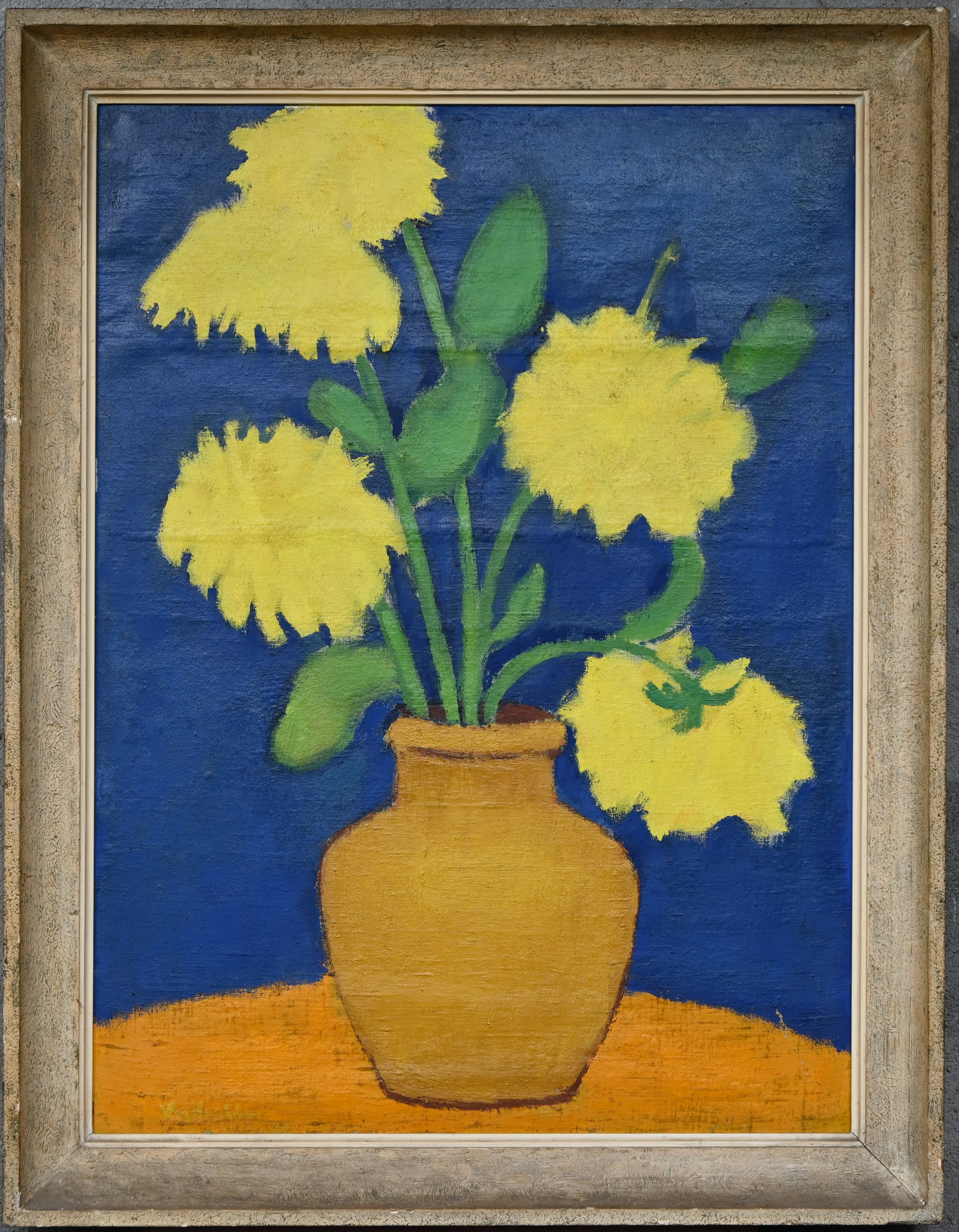 'Still Life with Flower Vase', an abstract impressionistic oil painting on canvas. Signed by Van Heesvelde.