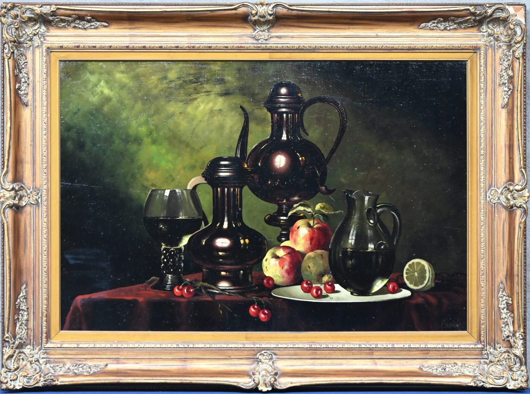 ‘Stilleven met fruit en glaswerk’, olieverf op doek. Naar de 19e eeuw, onleesbaar getekend.