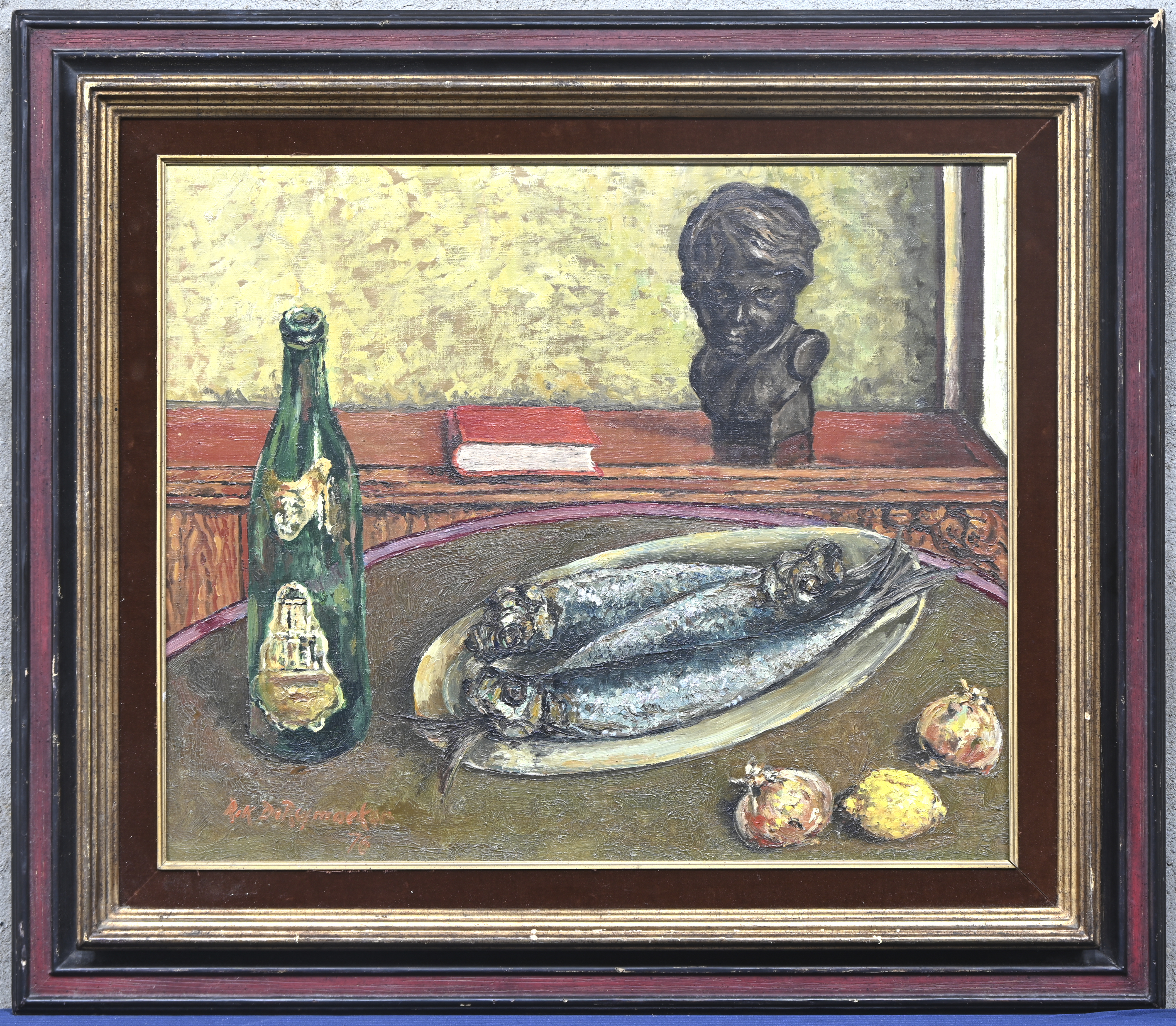 “Still Life with Smoked Herring,” an oil painting on canvas. Signed Rik De Reymaeker.