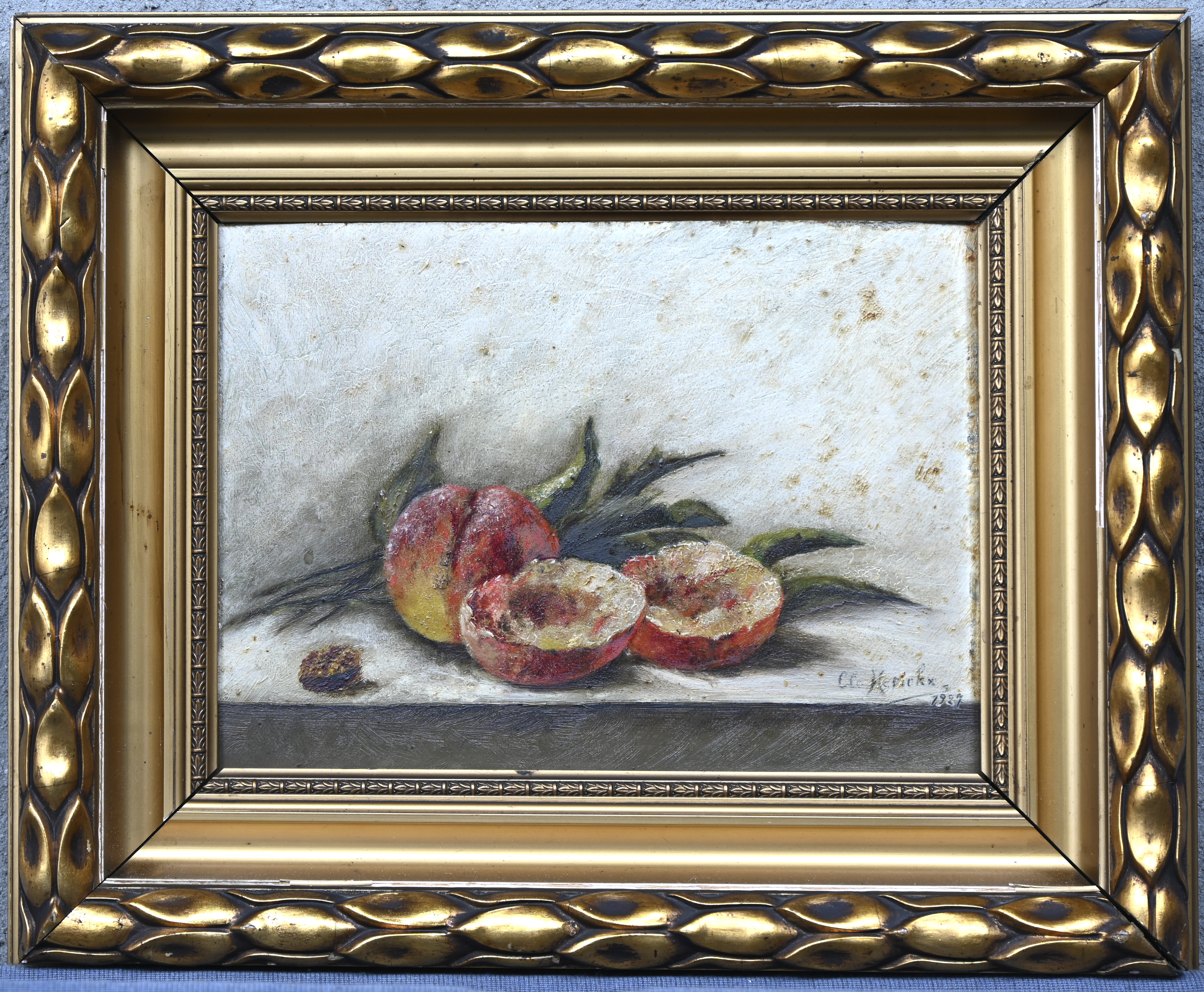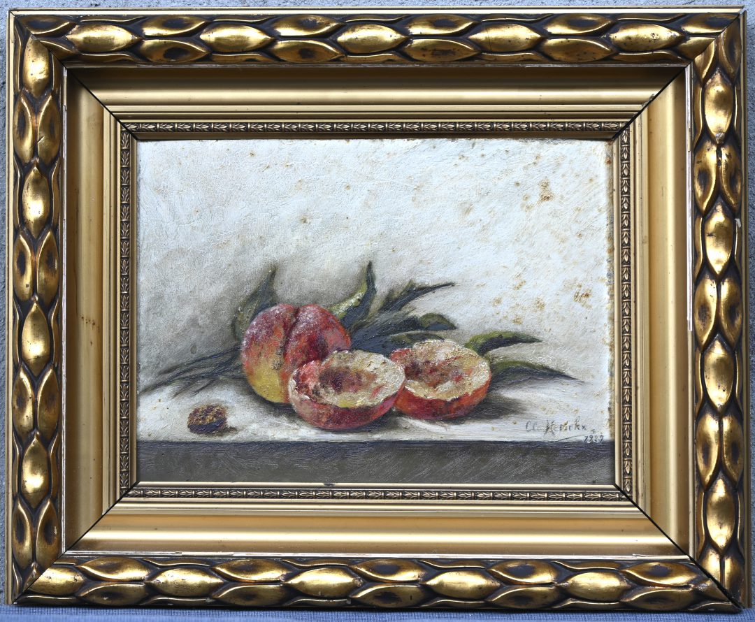 "Still life with jug and fruit". A painting, oil on panel, signed by Arens. Accompanied by a book about the life and work of the artist. -