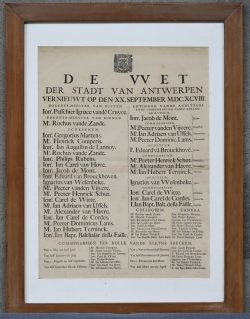 #574Period: 1698‘De wet der stadt van Antwerpen vernieuwt op den XX september MDCXCVIII’ (1698). Een 17e eeuwse aankondiging met de namen van het nieuwe stadsbestuur.