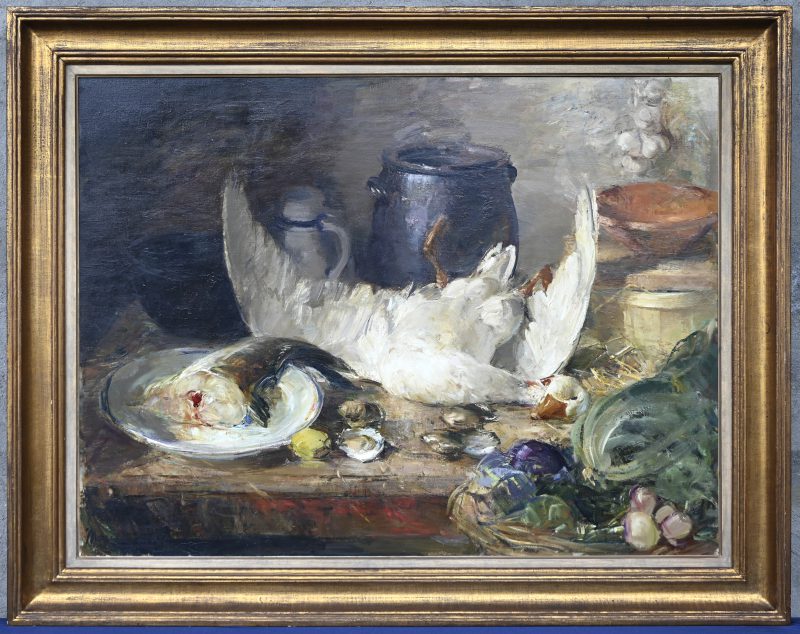 Still life with flowers and fruit in the style of the 19th century. Oil on canvas. Framed in a golden frame. Signed by Mary Tilman.No longer availableDim. 75/49 cmEstimate: € 450 / 650 -