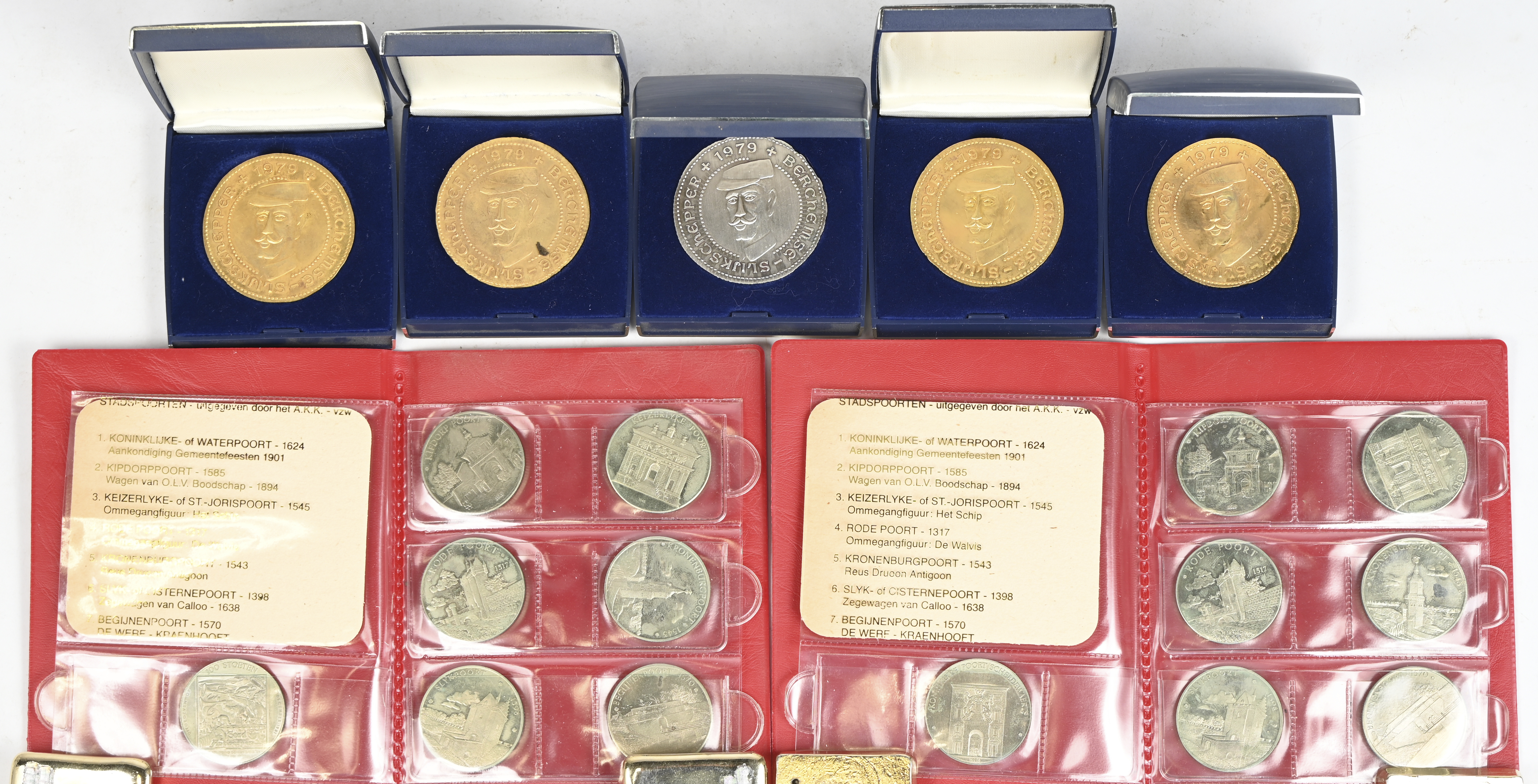 - “Stoet der stoeten 1982”. Twee mapjes met telkens zes penningen van messing-nikkel en koper-nikkel, vergezeld van een gelegenheidsbierkaart van Stella Artois.                                                                                                                                                                                                                                                                          - “Berchemse Slijkschepper 1979”. Vijf penningen van verguld brons in indivilduele etuis. Opschrift “Agrarium Gigantium Berchemiense”. Ter gelegenheid van de inauguratie van de reus Tuur De Slijkschepper.