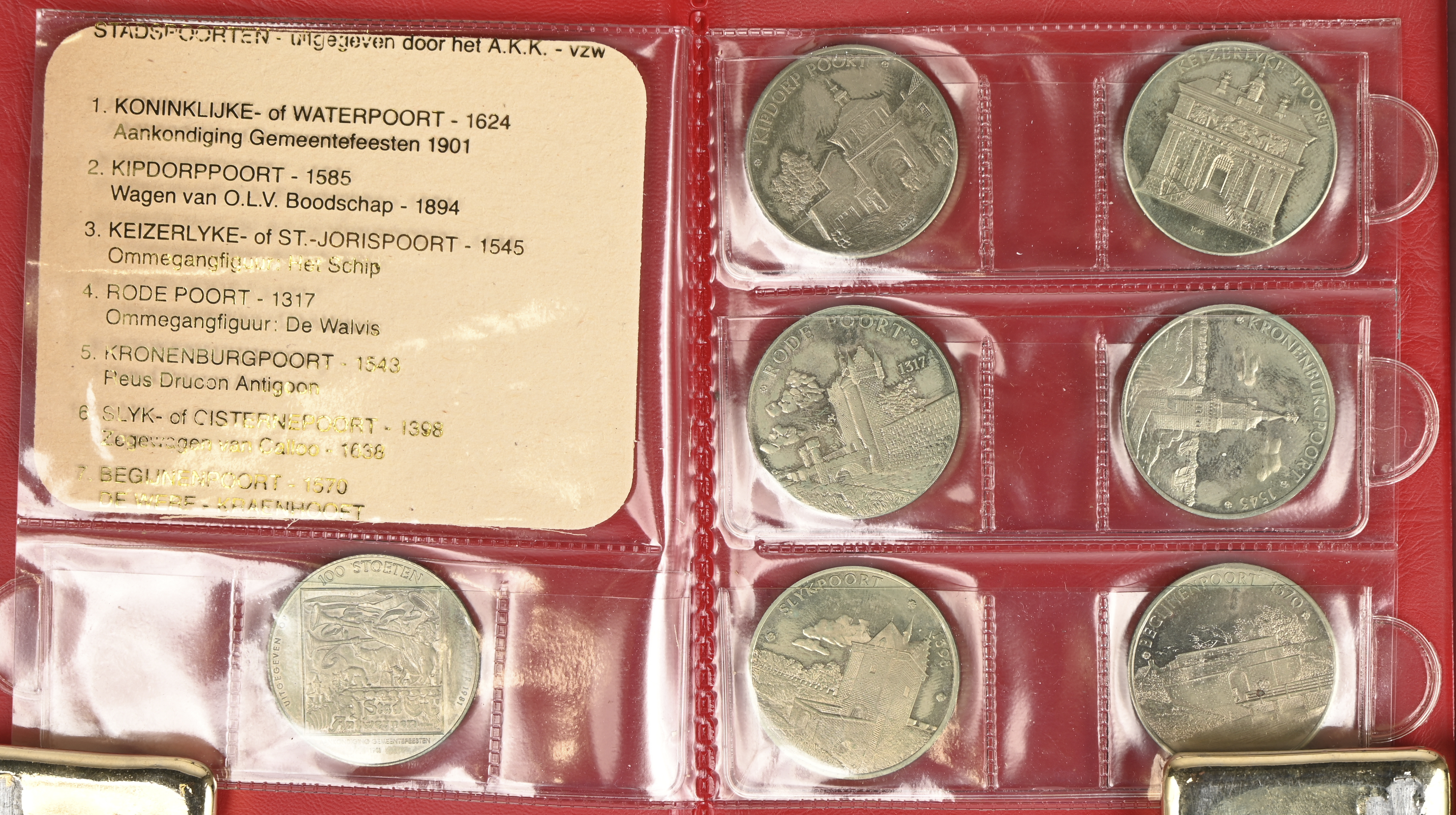 - “Stoet der stoeten 1982”. Twee mapjes met telkens zes penningen van messing-nikkel en koper-nikkel, vergezeld van een gelegenheidsbierkaart van Stella Artois.