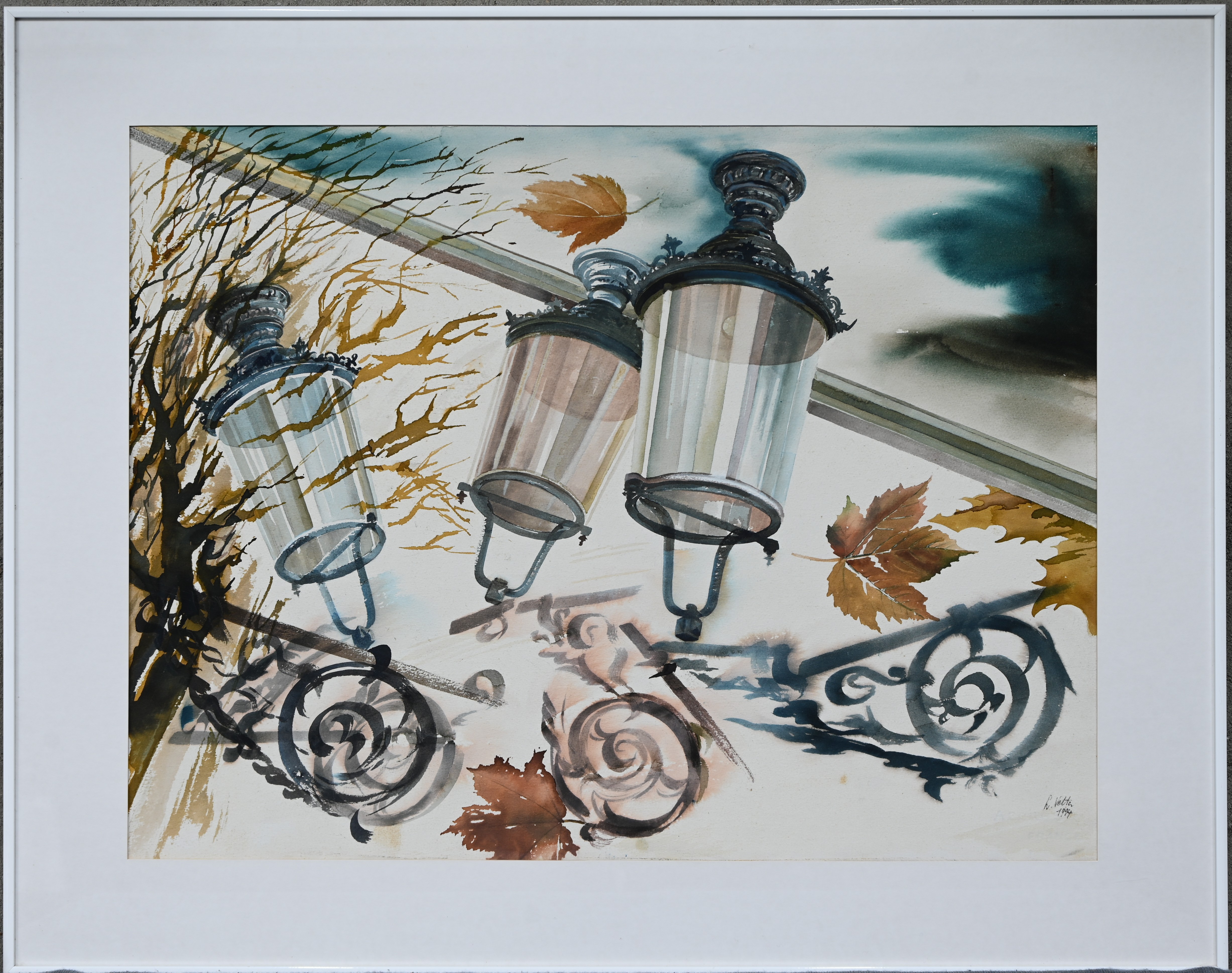 “Stormlampen”. Een schilderij, aquarel op papier. Onderaan gesigneerd en gedateerd.