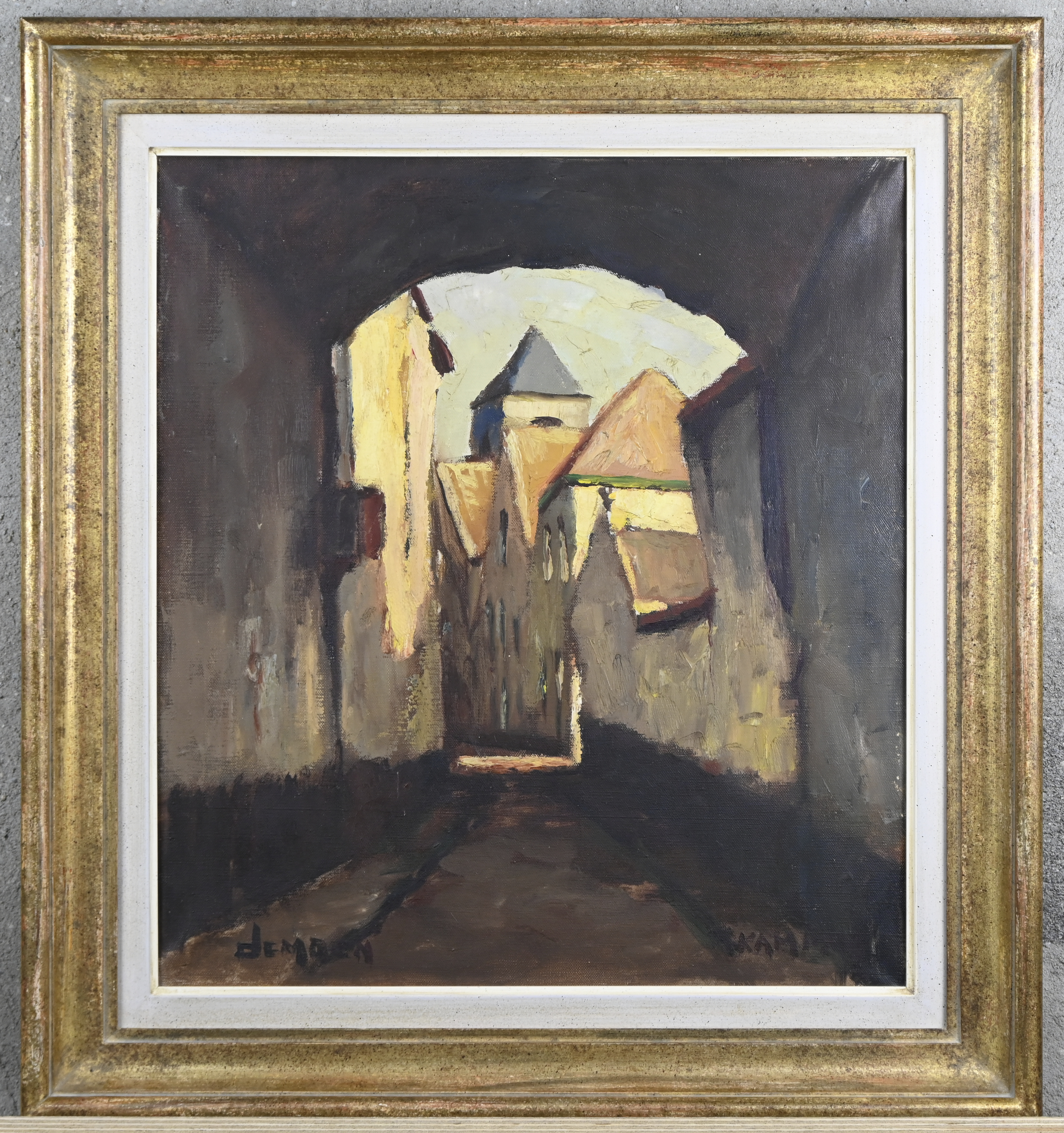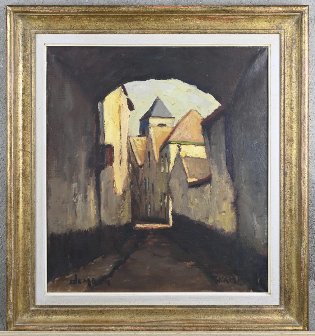 ‘Straatbeeld met oude vrouw’, olieverf op doek. Getekend; De Moen. Impressionistisch werk in gedempte tonen.