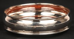 A wine bottle coaster, wood and silver, maker's mark RC: Carr's of Sheffield Ltd, 925, Sheffield, England with the millennium hallmark 2000. -