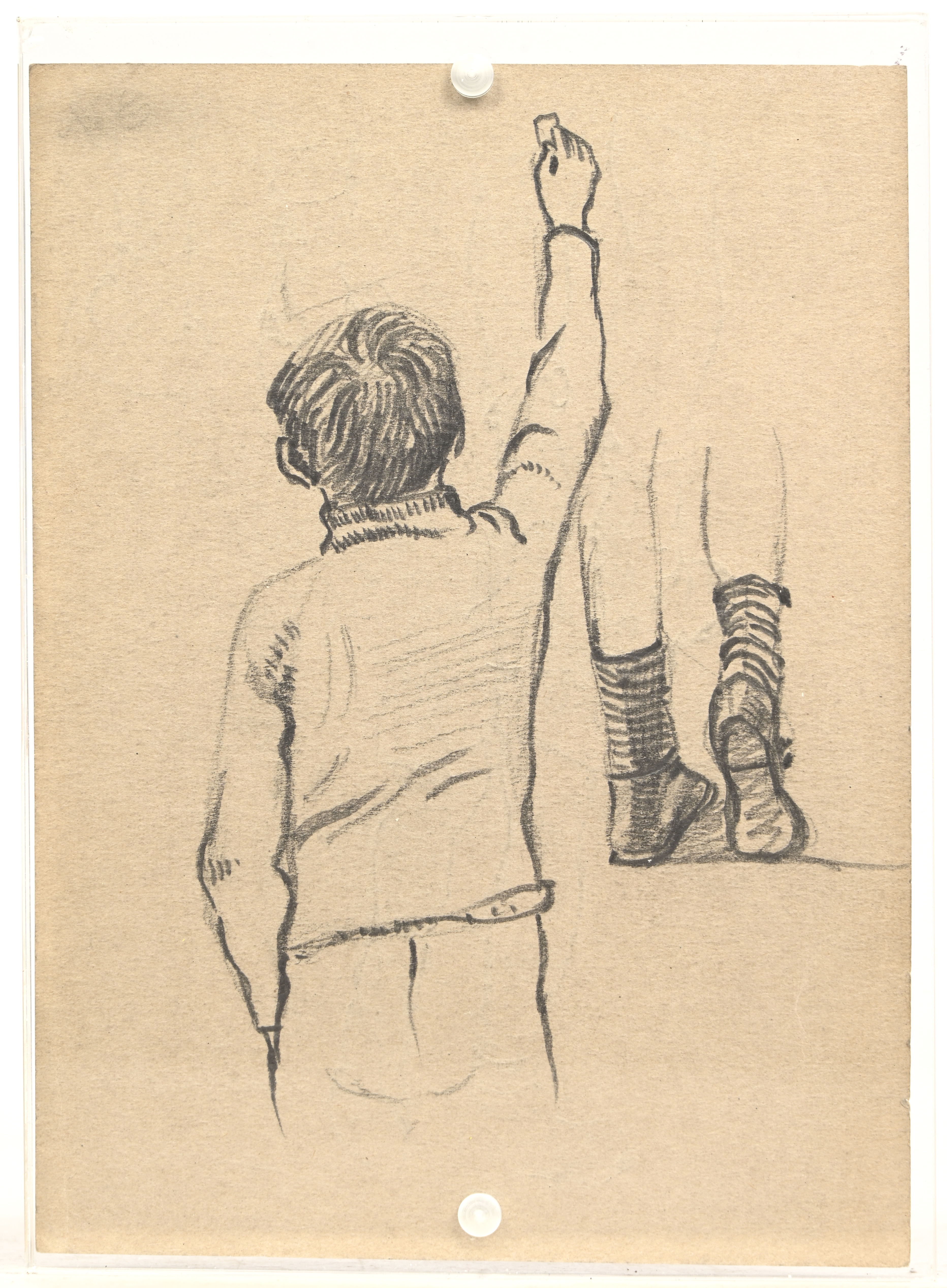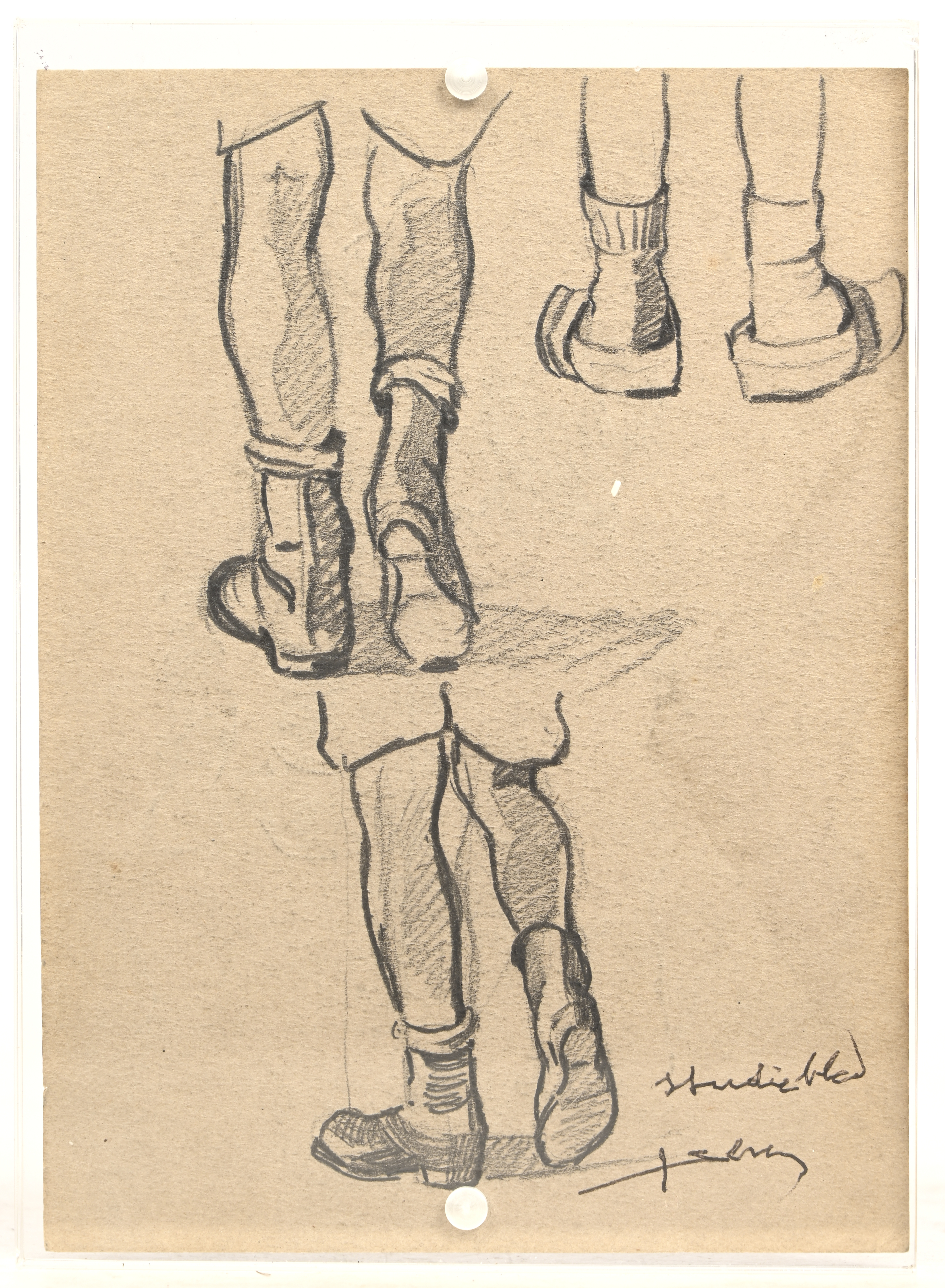 'Snowscape with Haystacks', chalk drawing on paper. Monogrammed E. V. -