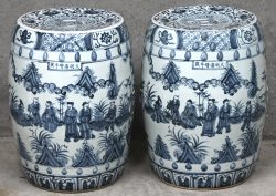 A set of 2 blue and white Chinese porcelain garden stools with figures and landscapes in the design. -