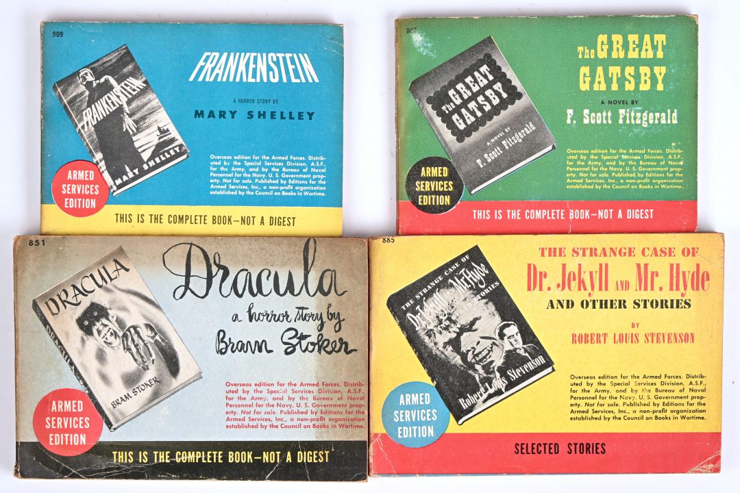 ‘The Great Gatsby’, ‘Frankenstein’, ‘Dr. Jekyll and Mr. Hyde’ and ‘Dracula’. Four paperbacks from the ‘Armed Services Edition’ series, published between 1943 and 1947.