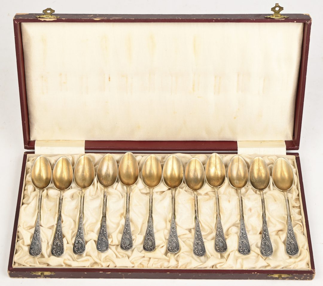 18 small silver spoons in case. Two different sizes. The largest are marked 800 and the smaller 835. With a combined gross weight of 410 grams. -