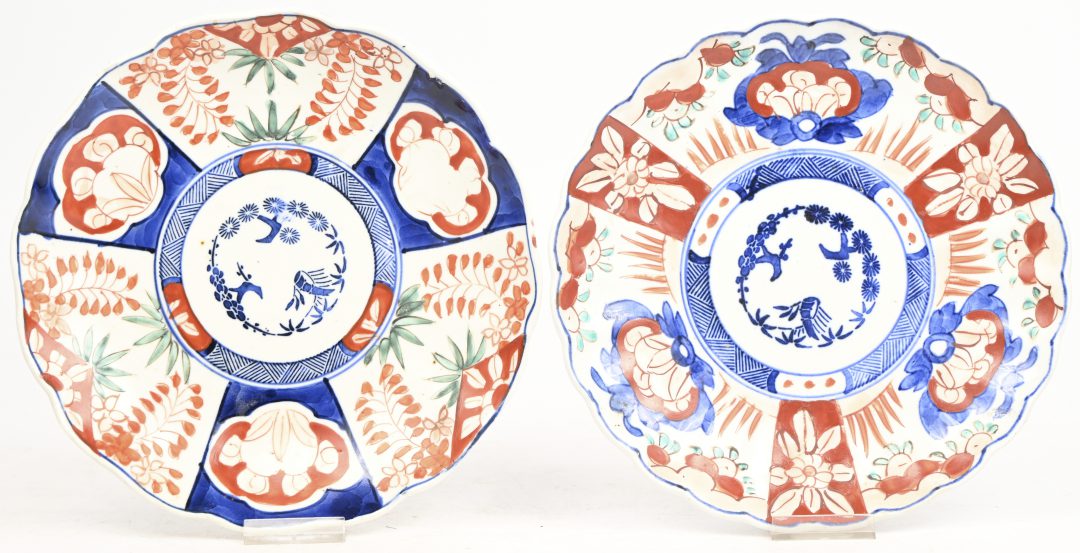 #83Een lot Chinees porseleinen borden, 4 meerkleurige en 4 blauw-witte. Enkele haarlijntjes.
